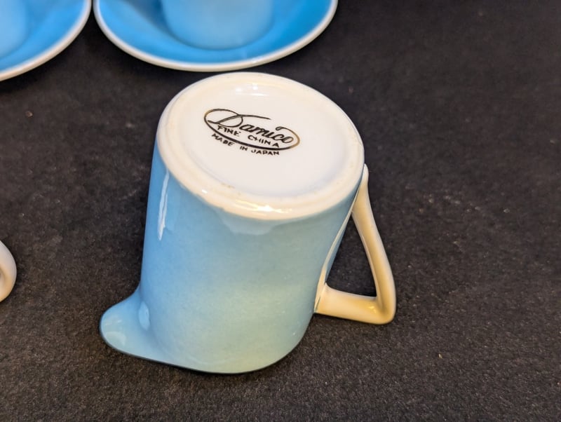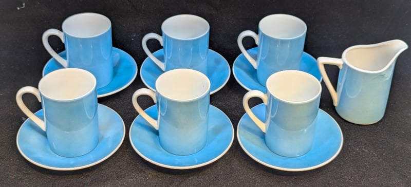 Includes Six Tea Cups, Six Tea Plates And One Milk Jug, Items Feature Blue Exterior With White Handles And Interior,