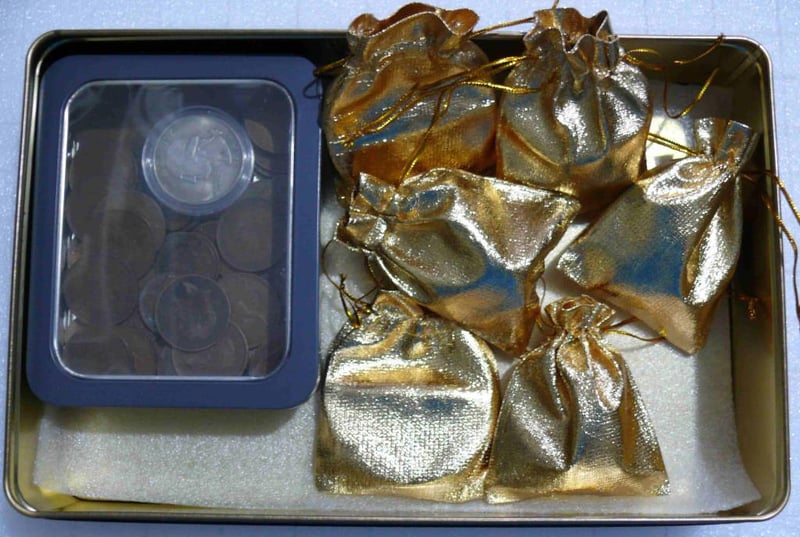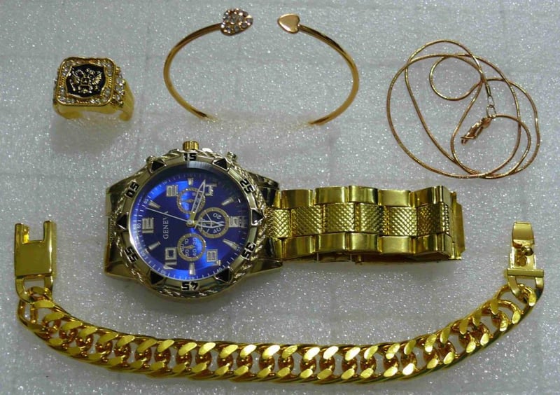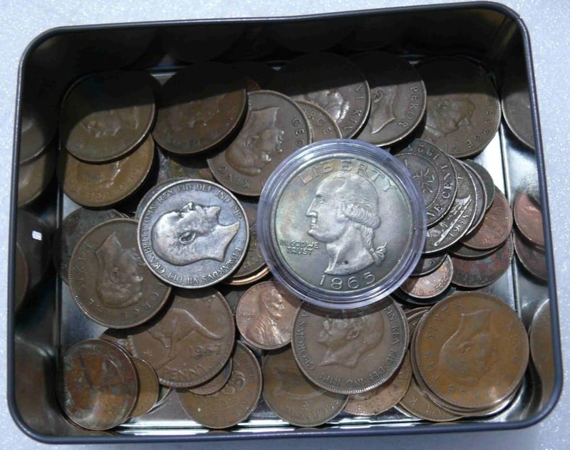 DECEASED ESTATE VINTAGE BOX OF ASSORTED ITEMS, CONTAINS, RING, BRACELETS, WATCH, BANGLES (UNKNOWN MATERIALS), COPPER COINS, AMERICAN COIN, ETC (PLEASE NOTE, UNCHECKED / UNTESTED ITEMS). 488381+29