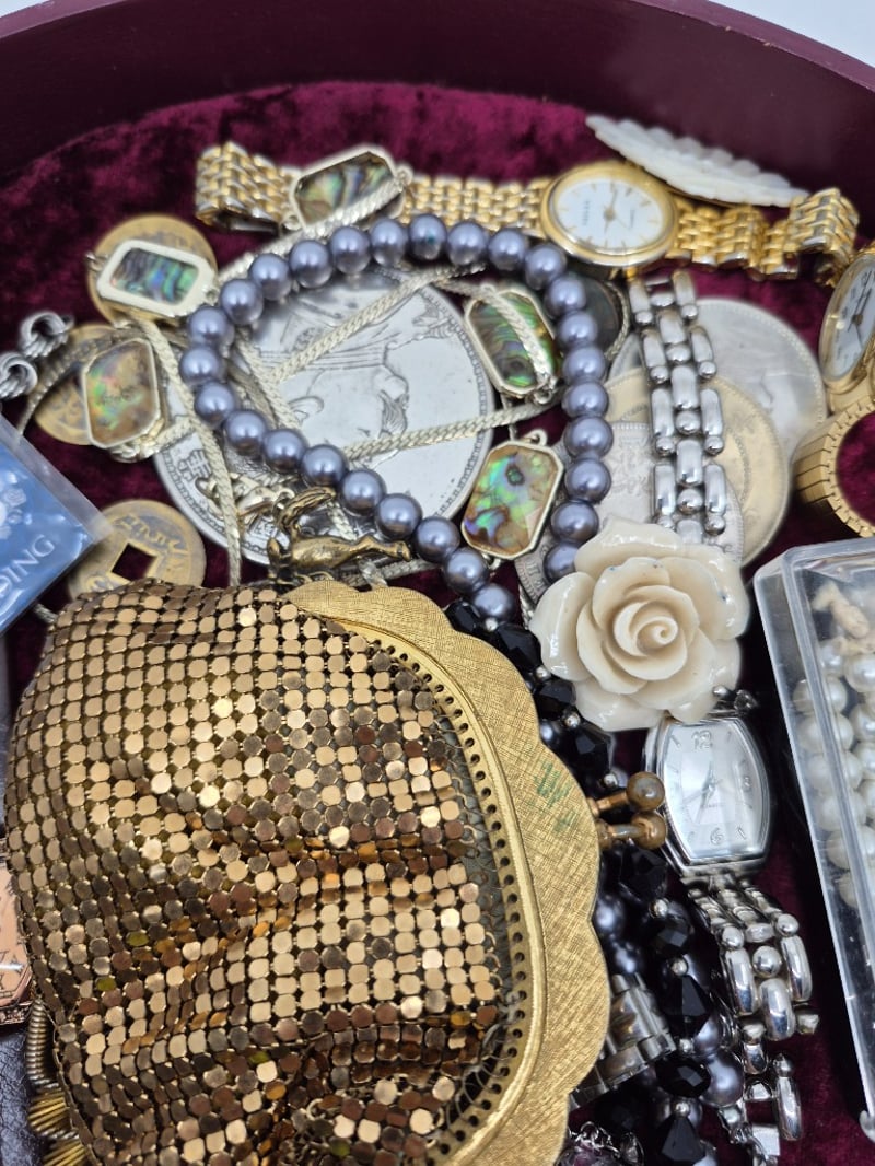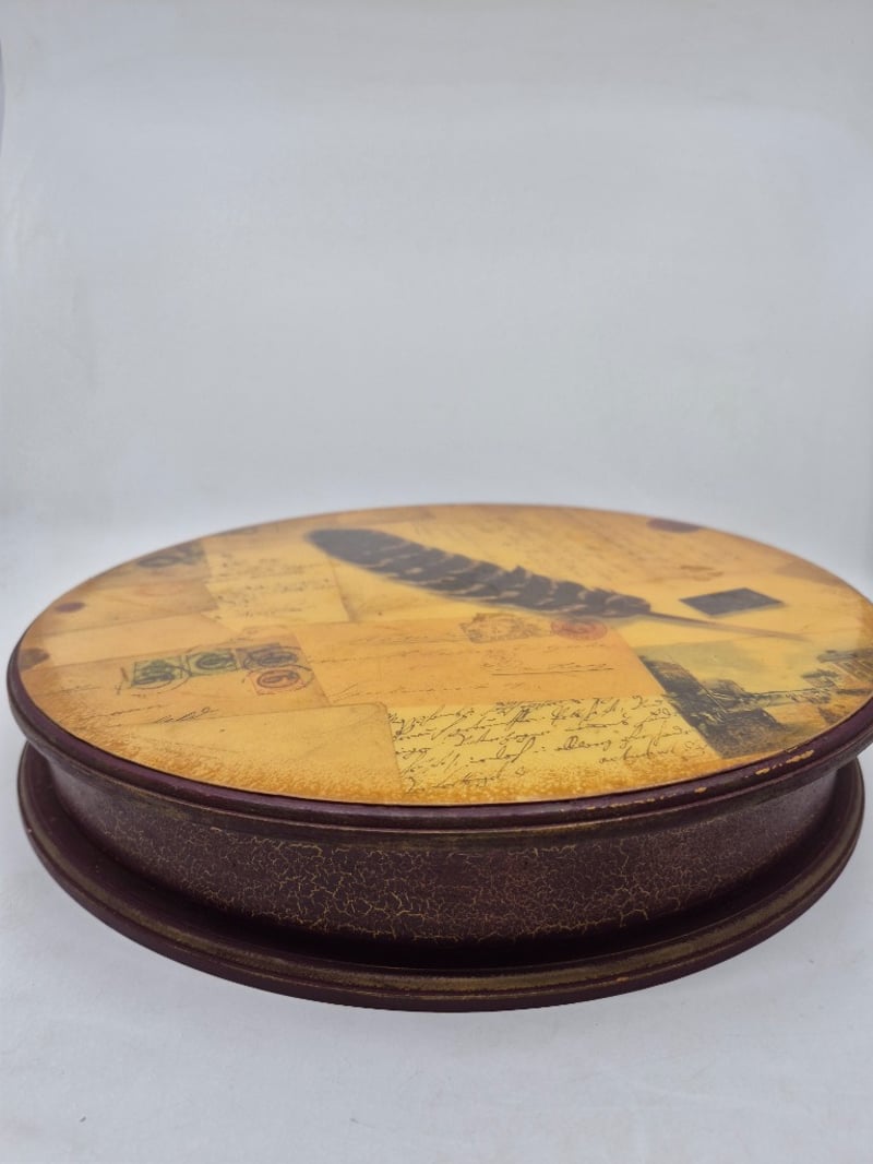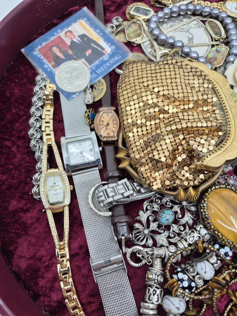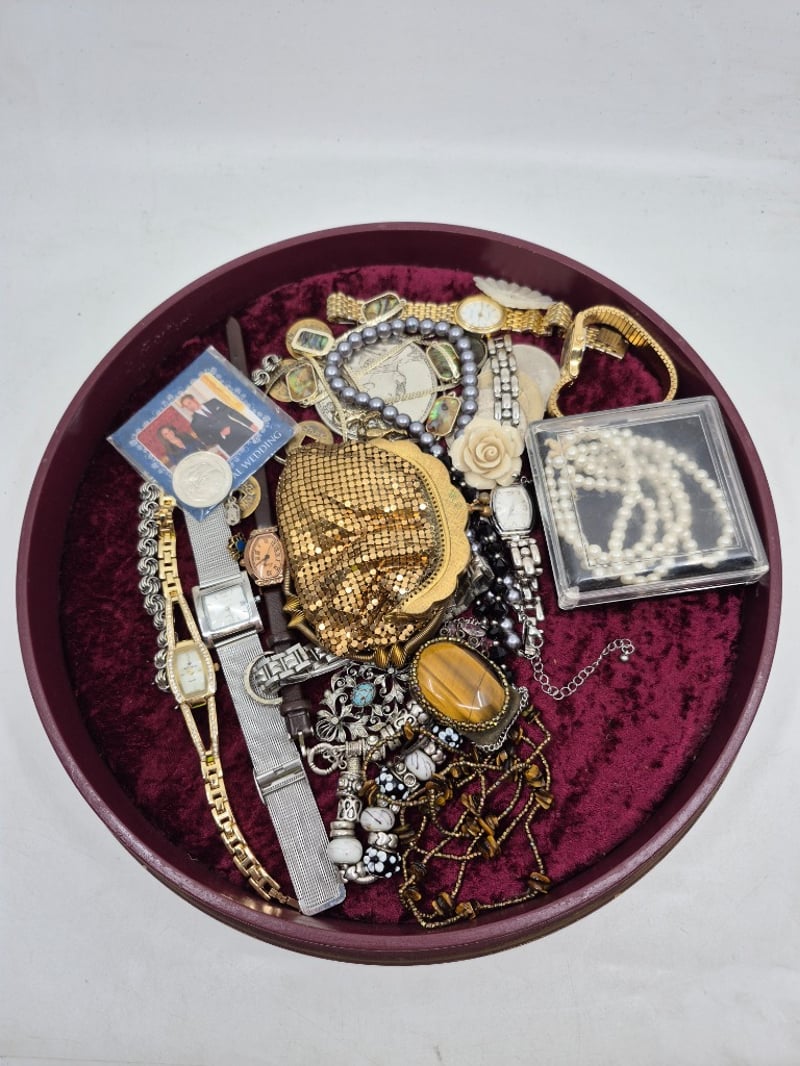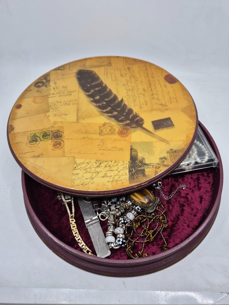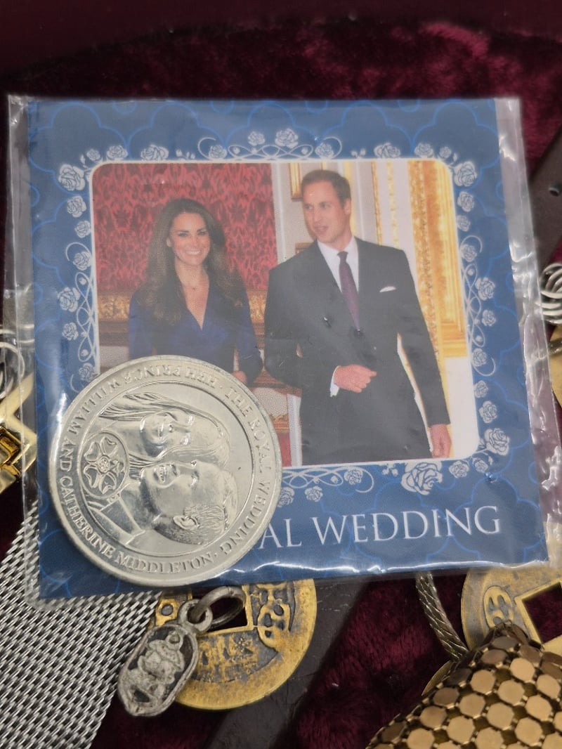 DECORATIVE CIRCULAR KEEPSAKE BOX WITH JEWELLERY COLLECTION AND ROYAL WEDDING MEMORABILIA Item Size: Weight: 2Kg Condition: Good - Refer To Images 11C 587733+1