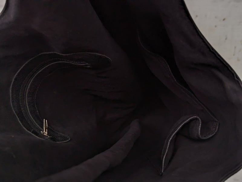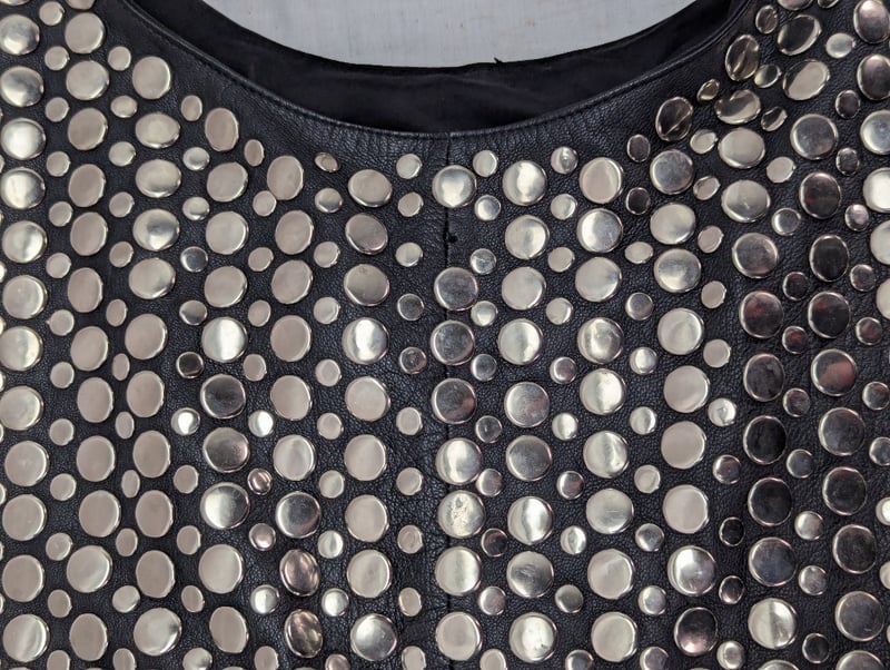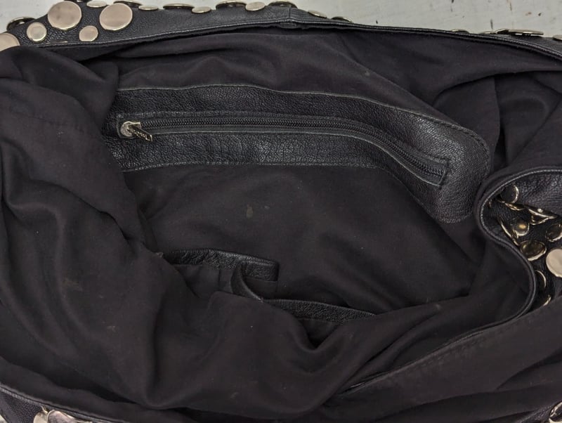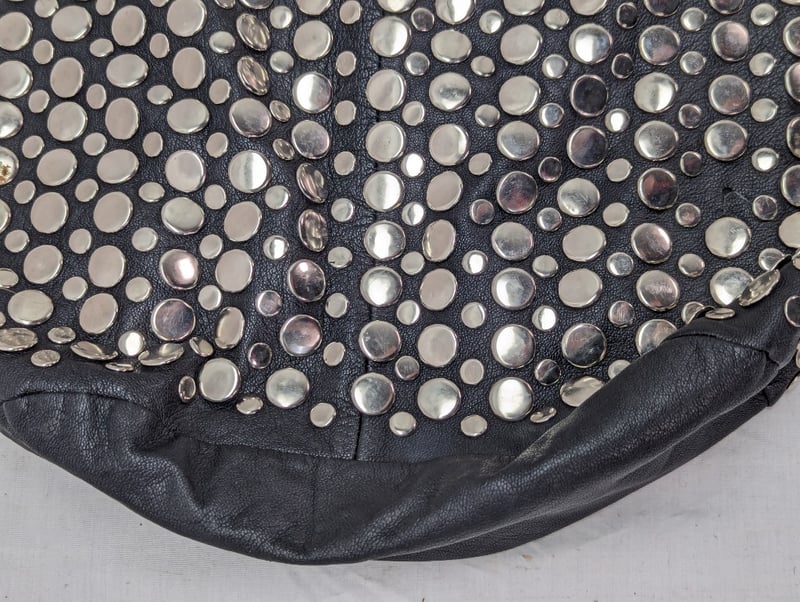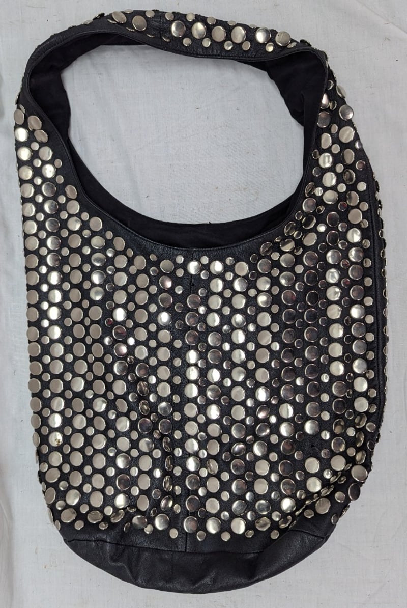 Bag With Single Shoulder Strap Connected To Main Body, Metal Disc Decoration Around Exterior, Main Compartment Features Two Small Pockets And One Zip Pocket