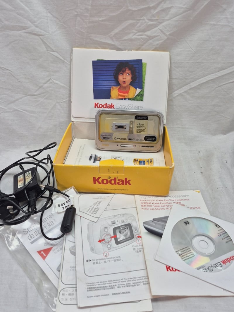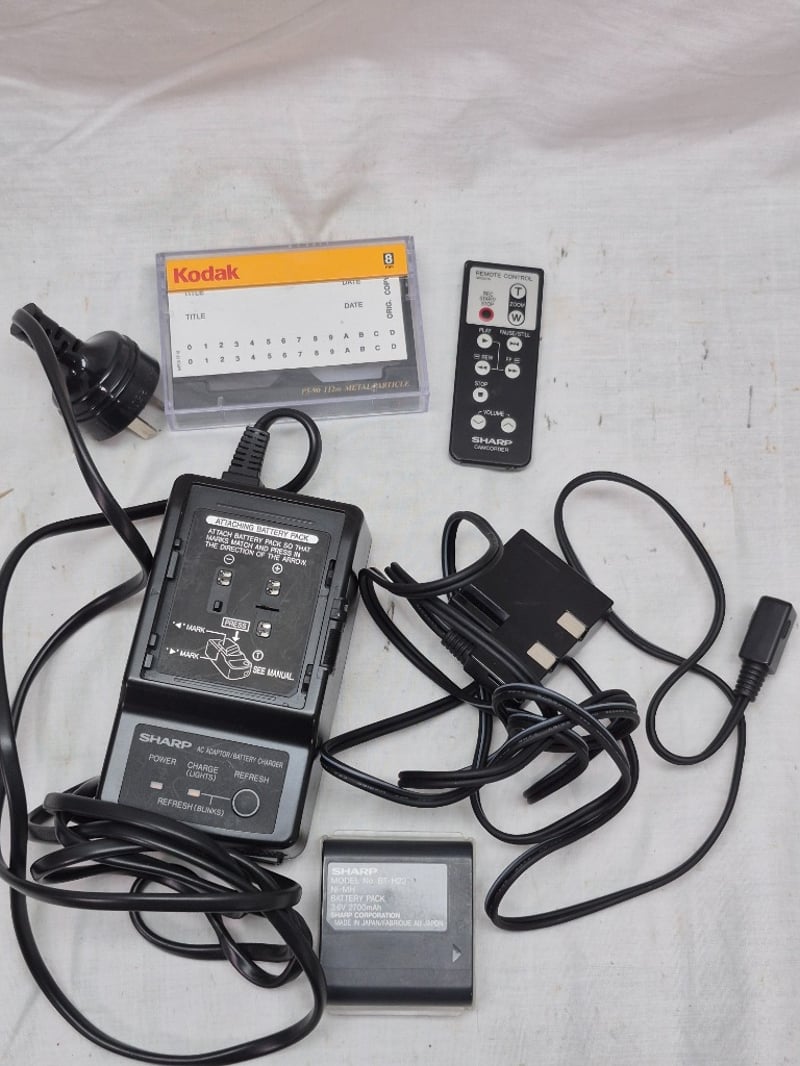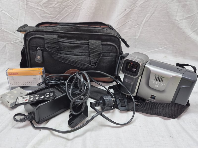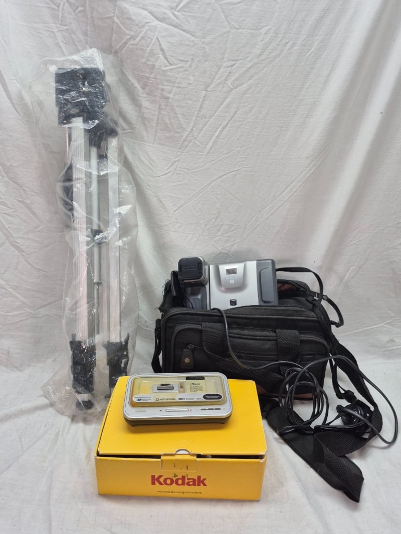 Untested Comprehensive Digital Imaging Collection Featuring Kodak Easyshare Camera Dock 6000 With Docking Station. Sharp Viewcam Digital Cam Corder Accessories Include Tripod With Spirit Level, Camera Bags, Power Adapters, Battery Chargers, Remote Controls, Instruction Manuals, Software Cd, Connecting Cables, And Protective Carrying Cases.