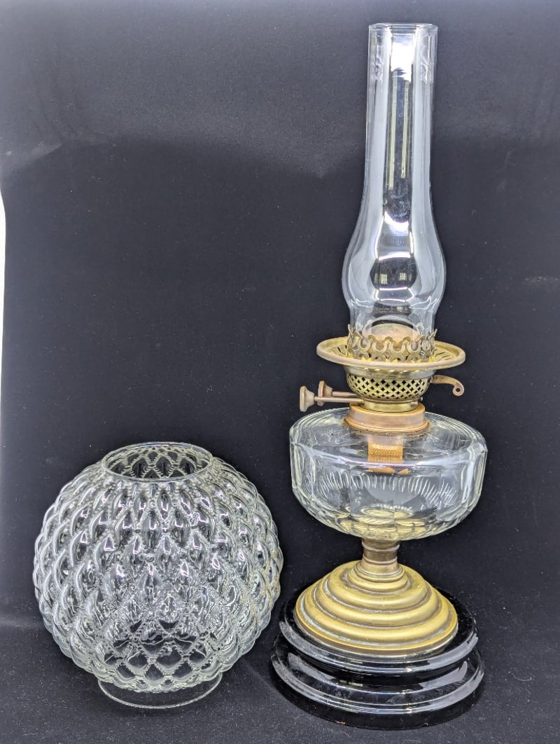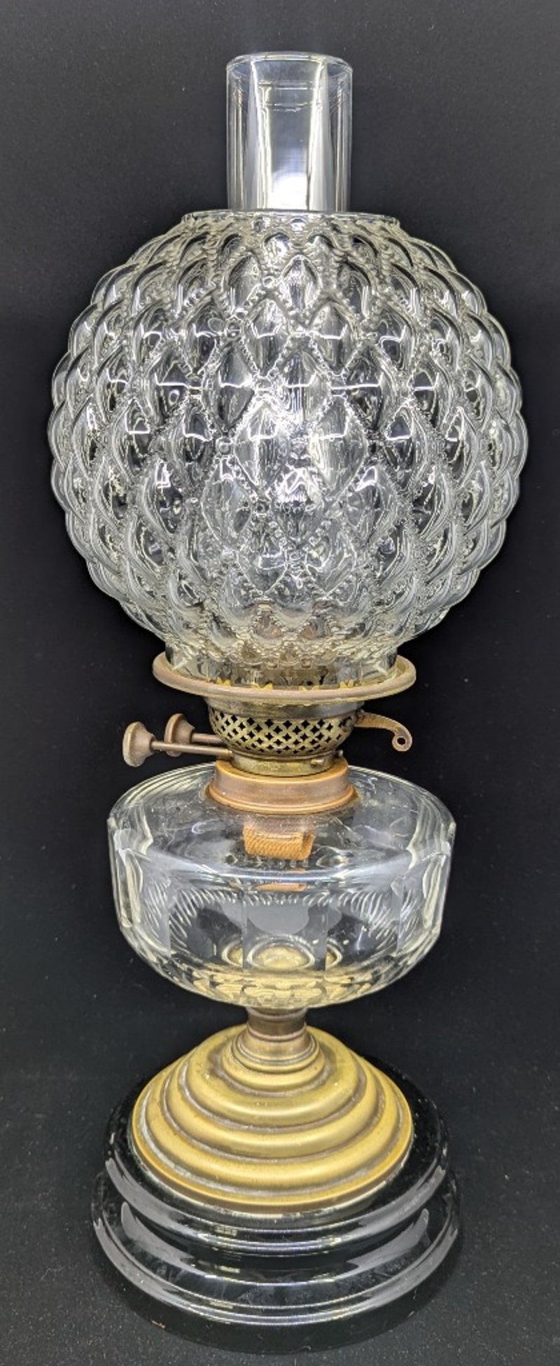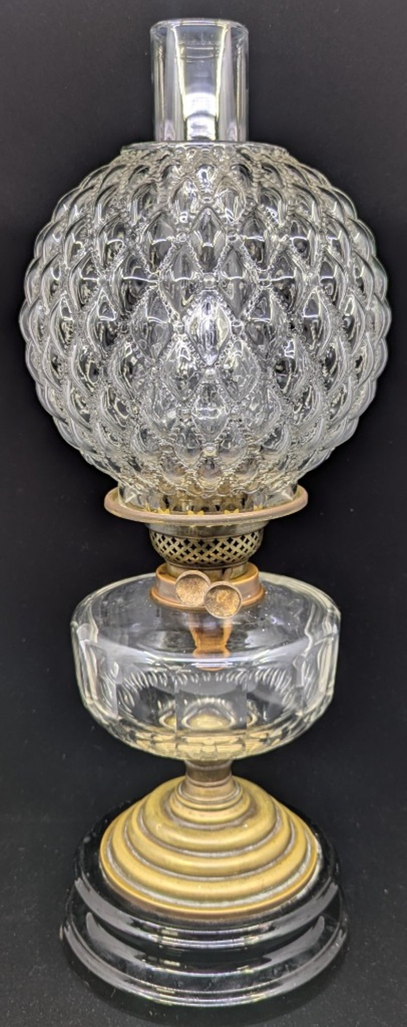 Lamp Features Timber And Metal Base, Glass Centre To Hold Oil, Includes Round Lamp Cover With Diamond Pattern Around Exterior