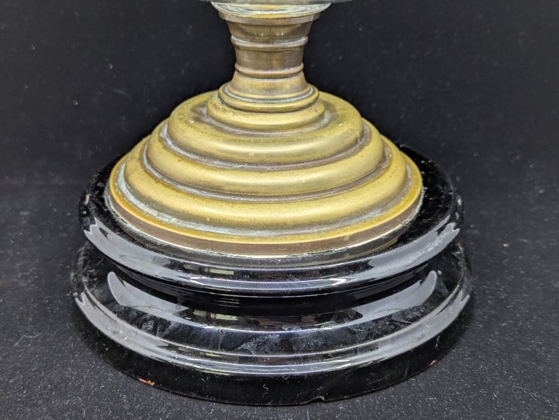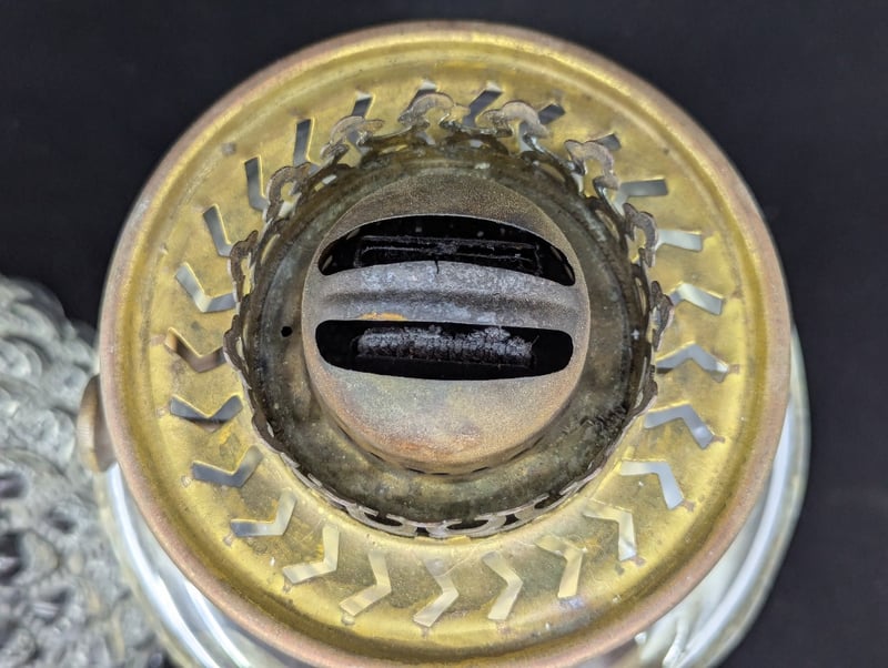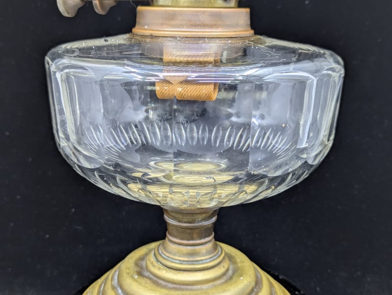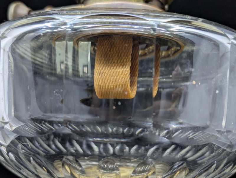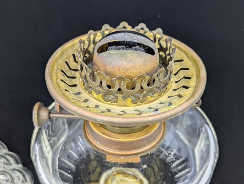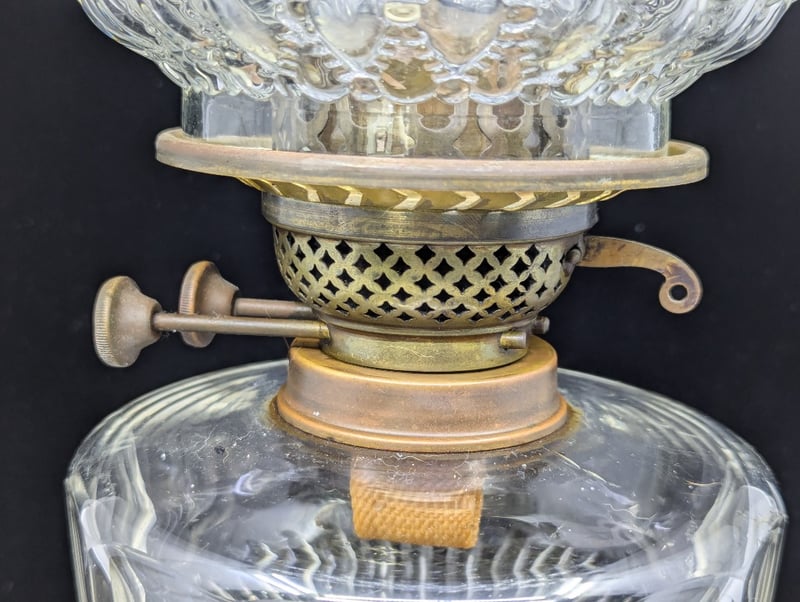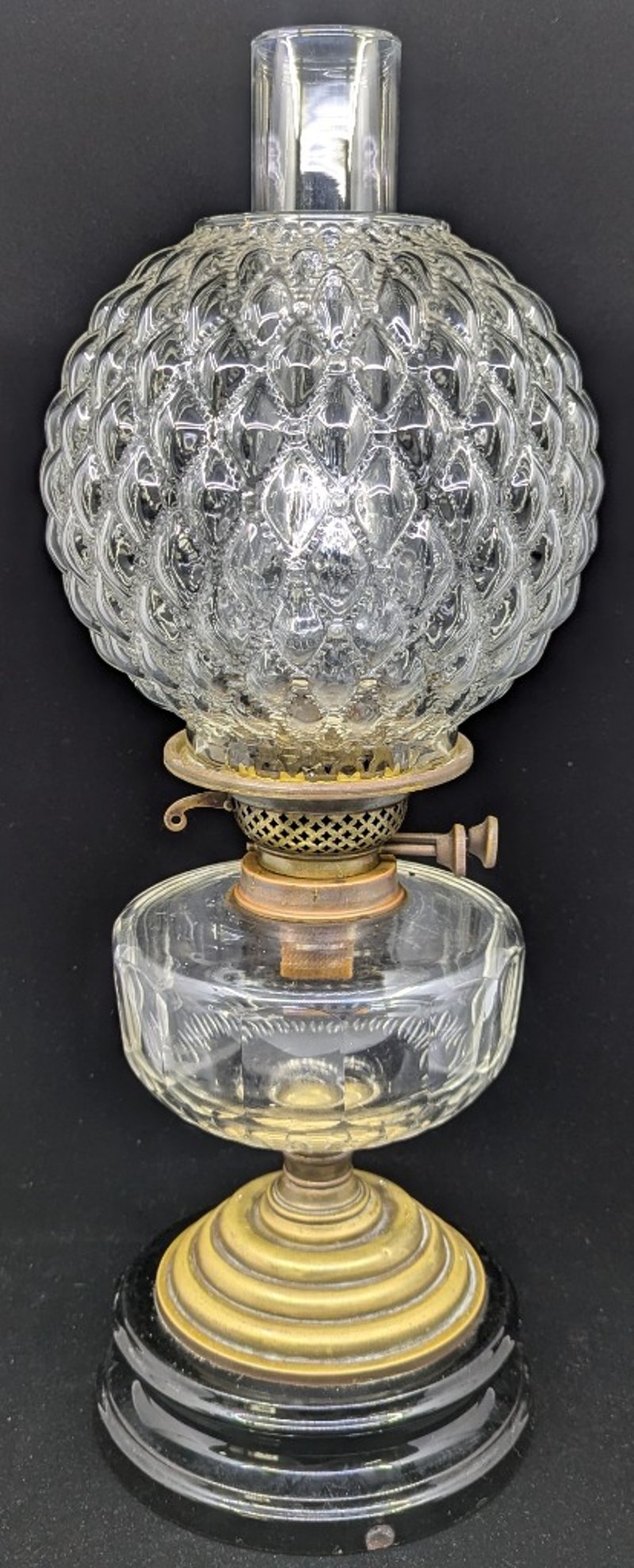 Lamp Features Timber And Metal Base, Glass Centre To Hold Oil, Includes Round Lamp Cover With Diamond Pattern Around Exterior