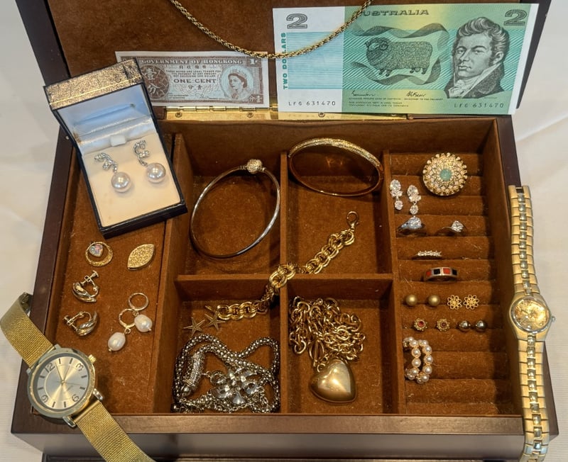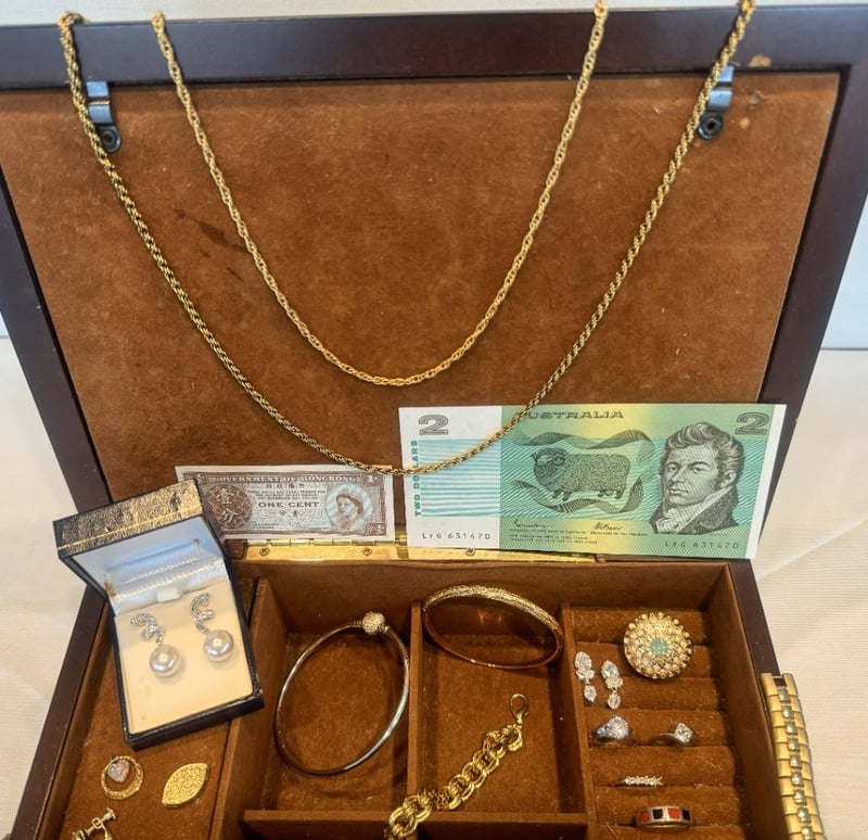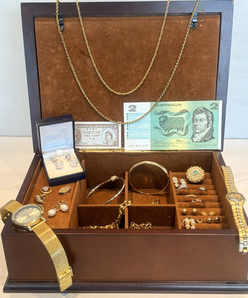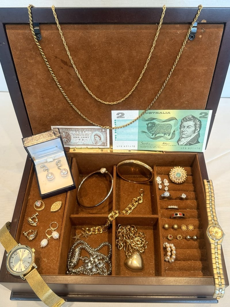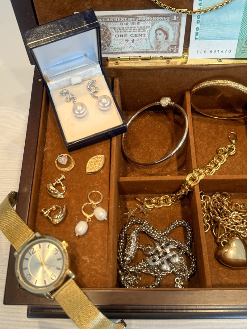 JEWELLERY BOX WITH BANK NOTES & ASSORTED JEWELLERY INCLUDES NATURAL PEARLS, NATURAL OPAL, STERLING SILVER & MORE. Item Size: Height: 22cm, Width: 13cm, Depth: 30cm, Weight: 1Kg Condition: Good - Refer To Images 11D 586270+5