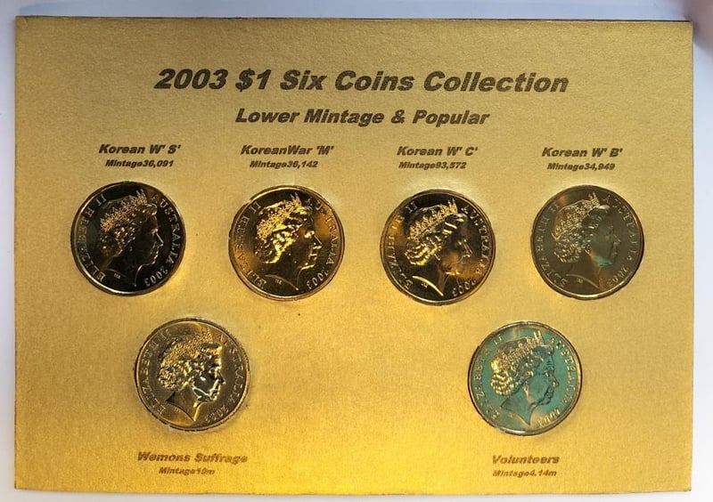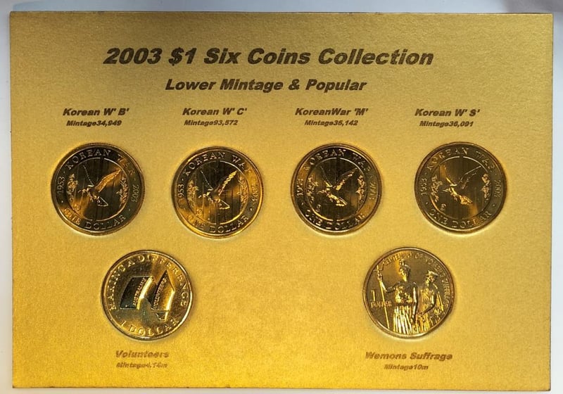 2003 SIX $1 COINS COLLECTION LOWER MINTAGE & POPULAR KOREAN WAR, VOLUNTEERS & WEMONS SUFFRAGE