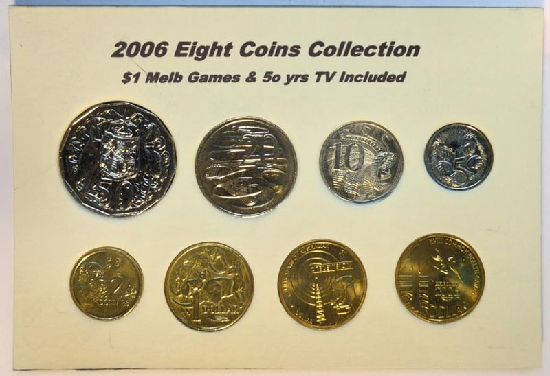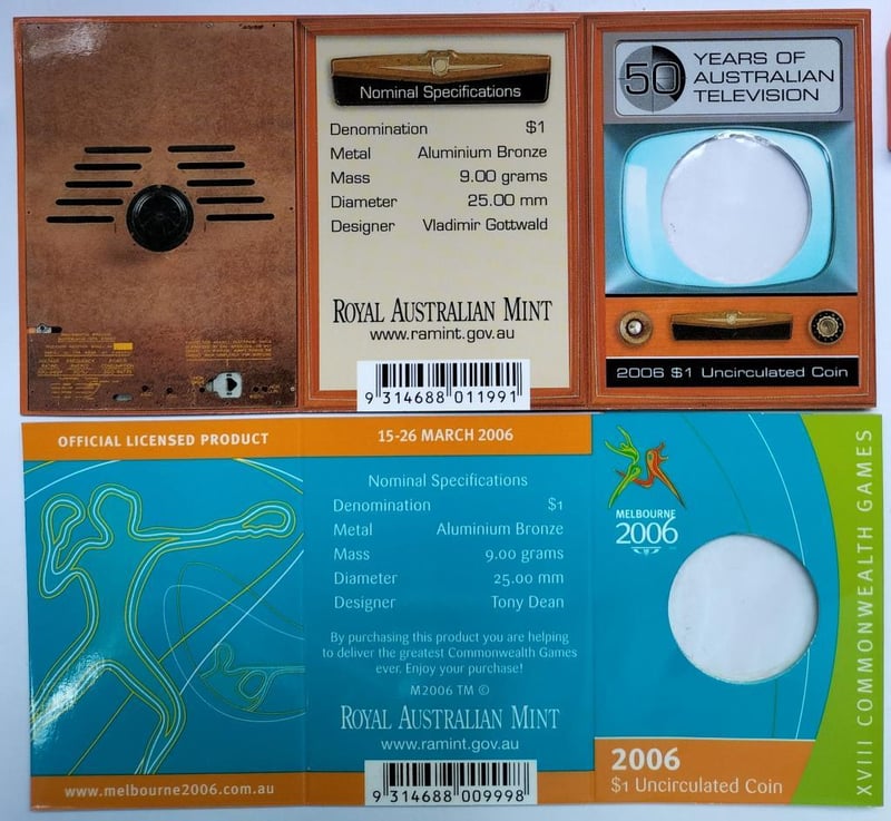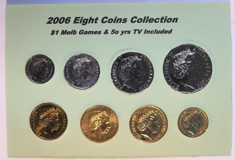 2006 EIGHT COINS COLLECTION TRIO $1 MELB. GAMES, 50 YRS TV & MOB OF ROOS INCLUDED Condition: UNCMint Folder488357+7