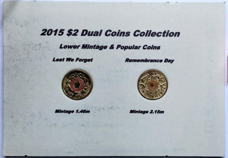 2015 DUAL $2 COINS COLLECTION LOWER MINTAGE & POPULAR COINS LEST WE FORGET(RED RING) & REMEMBRANCE DAY(ORANGE RING) Condition: UNCEx Mint Roll488357+15