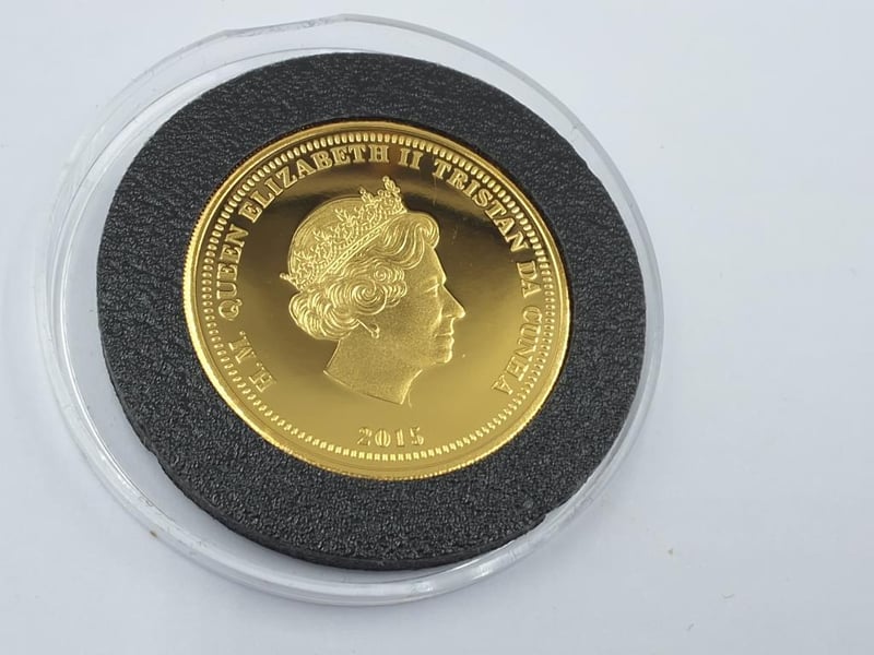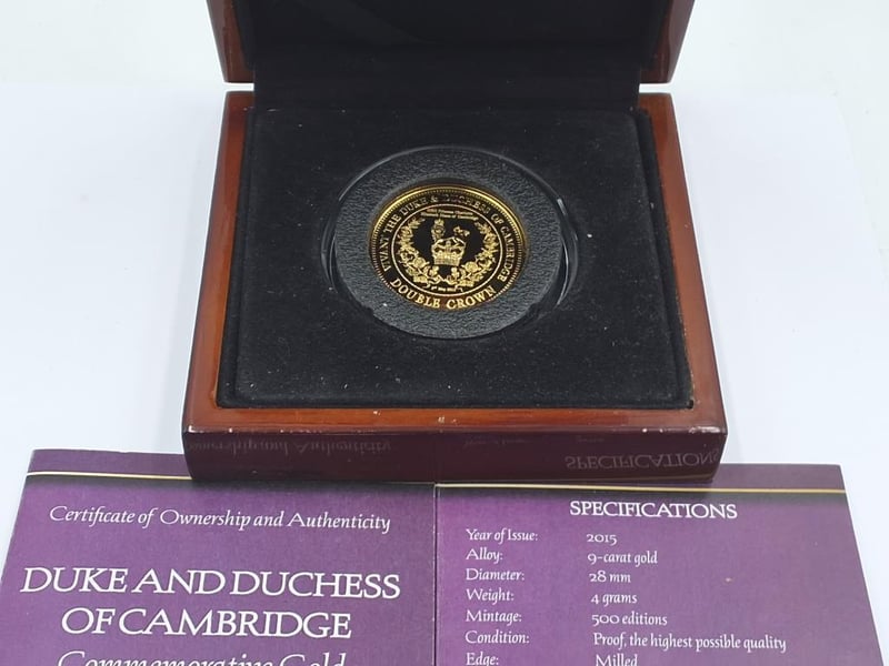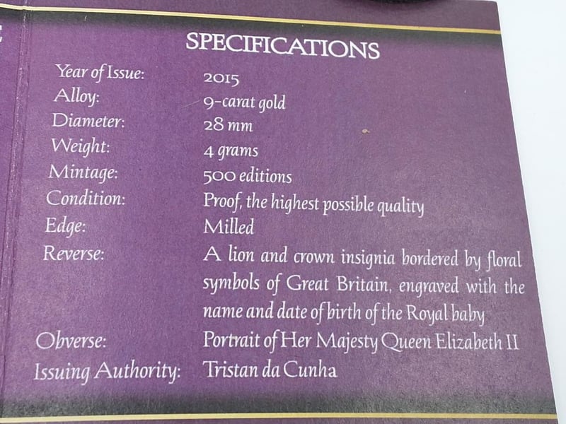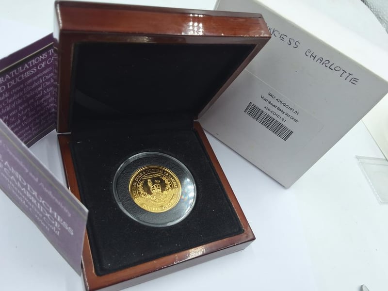 GOLD COMMEMORATIVE PROOF COIN : 9CT , 4 GRAMS ISSUED 2015 (FOR THE BIRTH OF PRINCESS CHALOTTE , THE DAUGHTER OF THE PRINCE & PRINCESS OF CAMBRIDGE) IN ITS PLUSH TIMBER CASE WITH A TINY MINTAGE OF 500. 782478+19