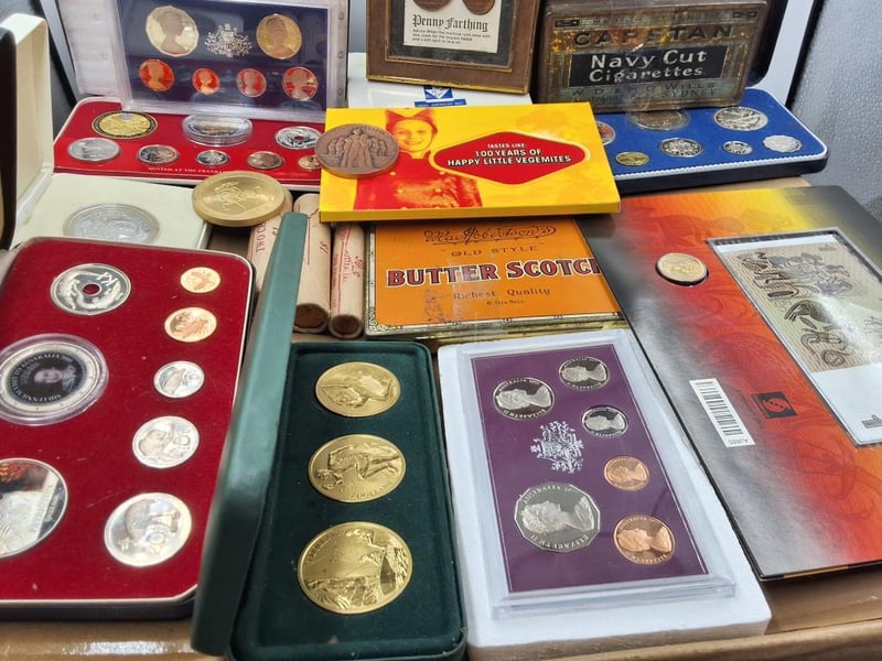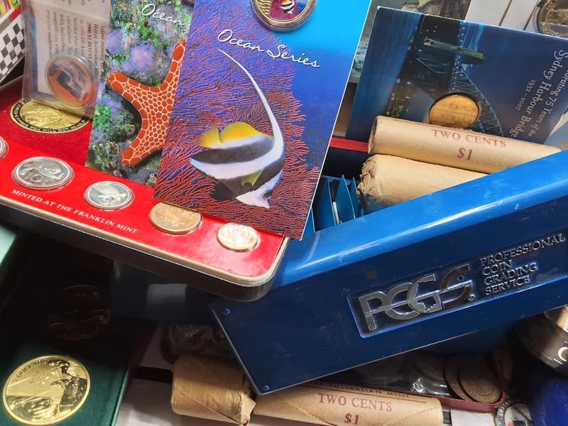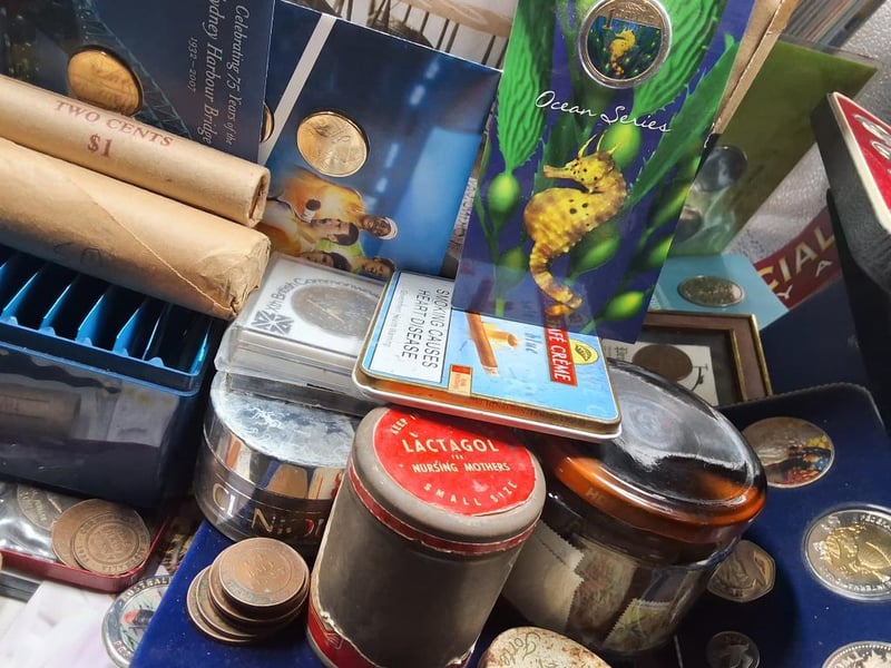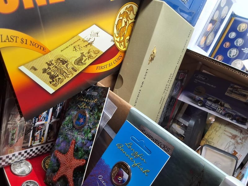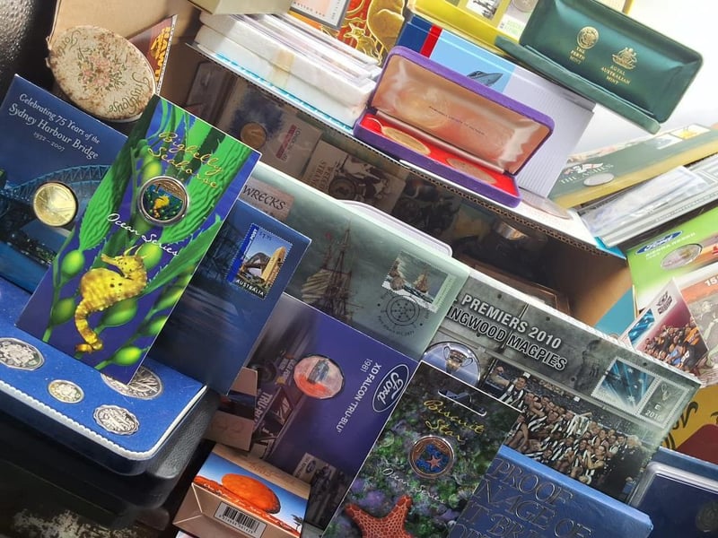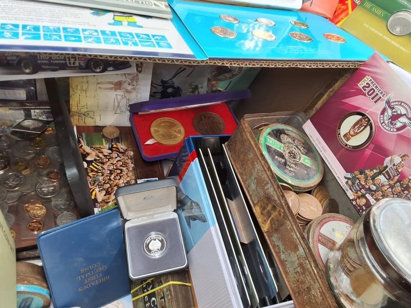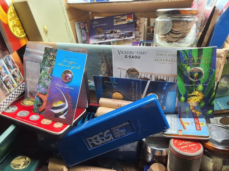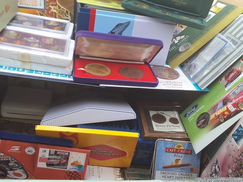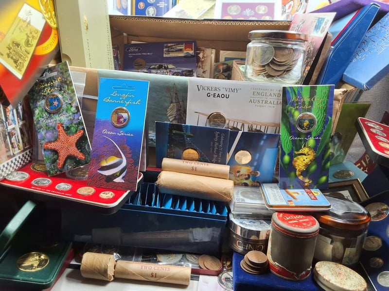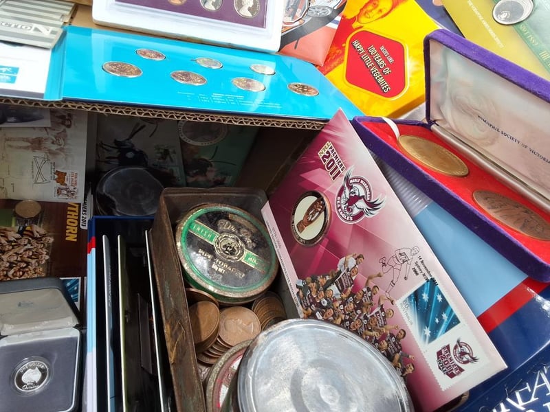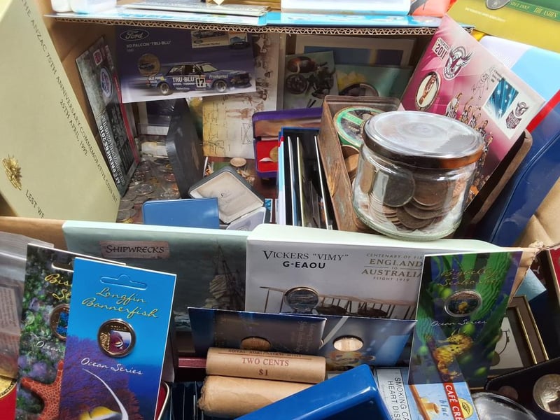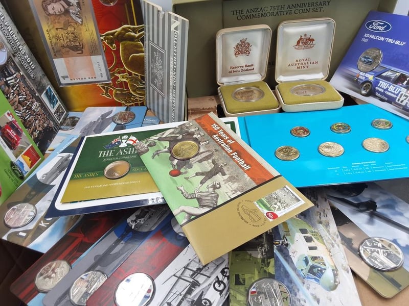 HUGE COLLECTION & HEAVY (450 × 450 ×, 290) : FULL OF RAM PRODUCTS E,G. PROOF & MINT SETS , COLOURED $1 & $2 COINS , PNC$S , $1 CARDED MINTMARK COINS , CASED AUSTRALIAN PROOFS , CASED WORLD PROOFS ( SOME COLOURED CROWNS OF UNKNOWN PROVENENCE) . TINS & JARS OF AUSTRALIAN PRE DECIMAL , CASE , TINS OF AUSTRALIAN STAMPS (1,00'S) , CASED PAIR ANZAC PROOF $5 COINS (AS ISSUED IN PRESENTATION CASE) , RAM & PRE DEC ROLLS , TIN OF ANCIENT ROMAN COINS , AFL SET CAPTAINS' MEDALS , SHEETS OF COINS , BANKNOTES...........HEAPS !!! 782478+40