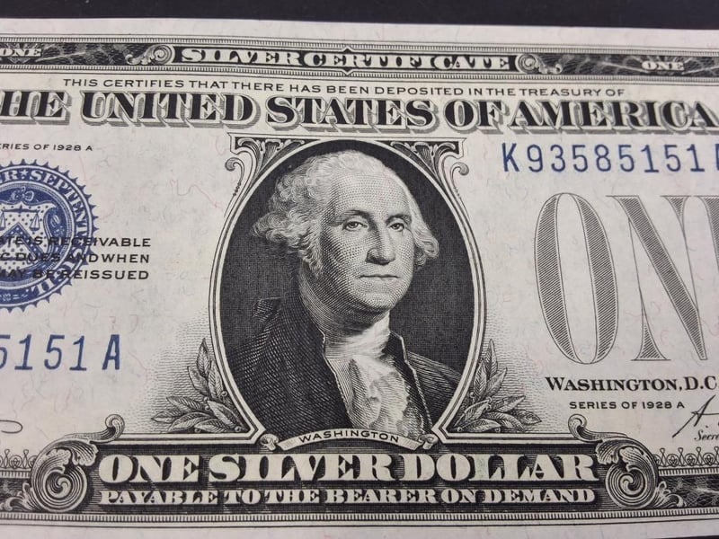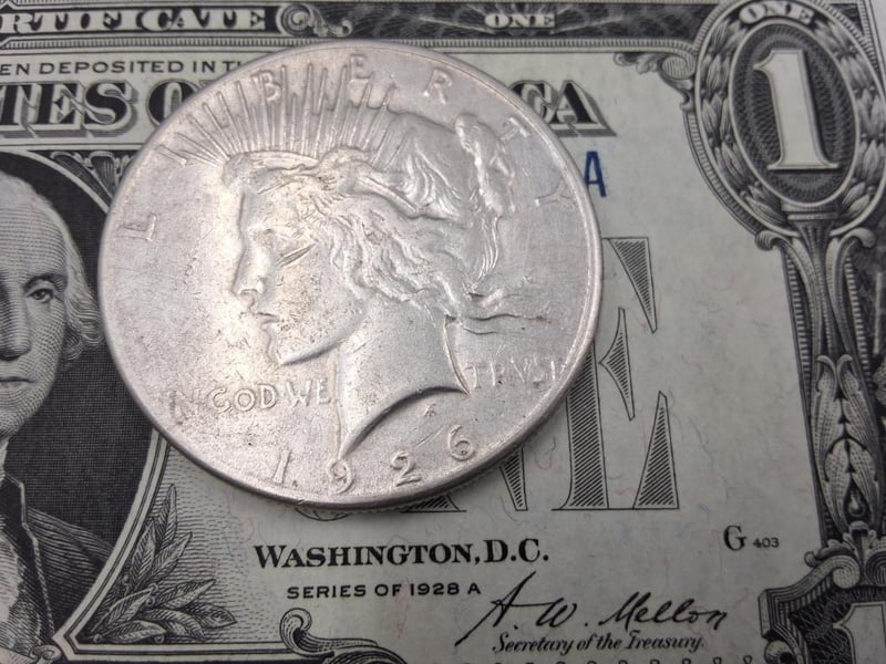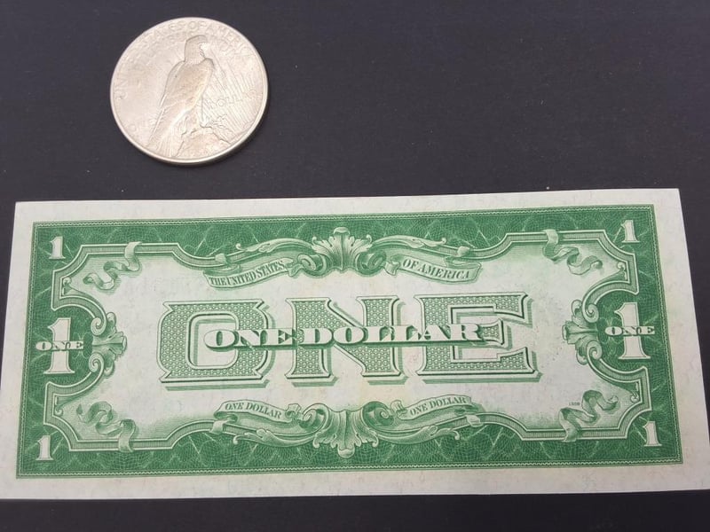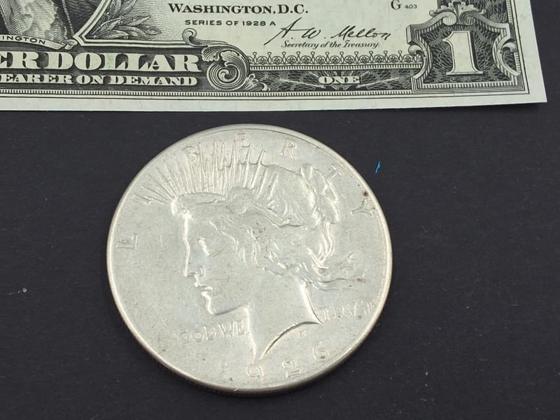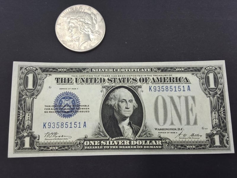 1928 "SILVER CERTIFICATE" USA ONE DOLLAR BANKNOTE : "IN THE TREASURY OF THE USA ONE SILVER DOLLAR PAYABLE TO THE BEARER ON DEMAND" (THIS WAS TO GIVE CONFIDENCE TO PAPER MONEY IN THE INFLATIONARY 1920'S PERIOD) AND A TYPICAL SILVER DOLLAR HELD IN THE TREASURY. CONDITION : THE NOTE "AUNC" , THE $1 DATED 1926 (PEACE TYPE)"VF". 782478+30