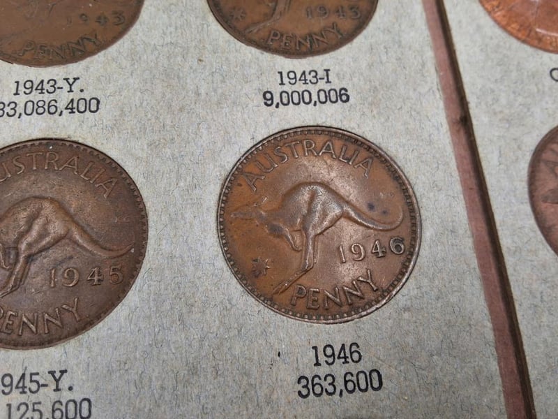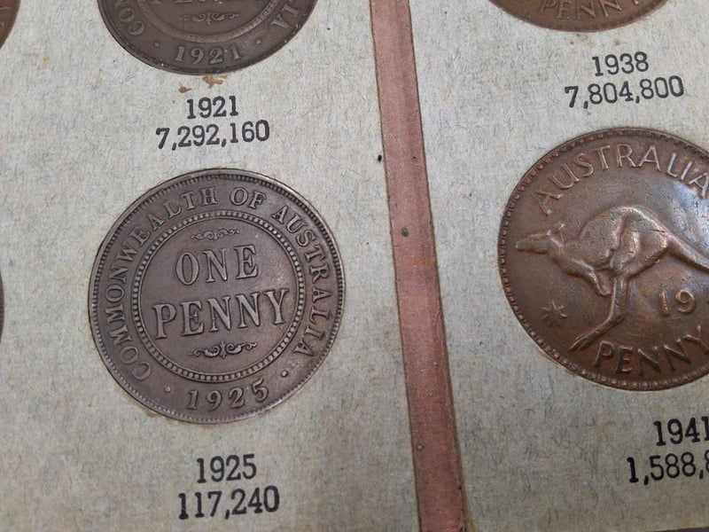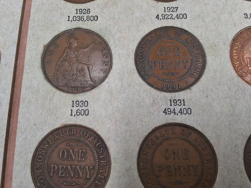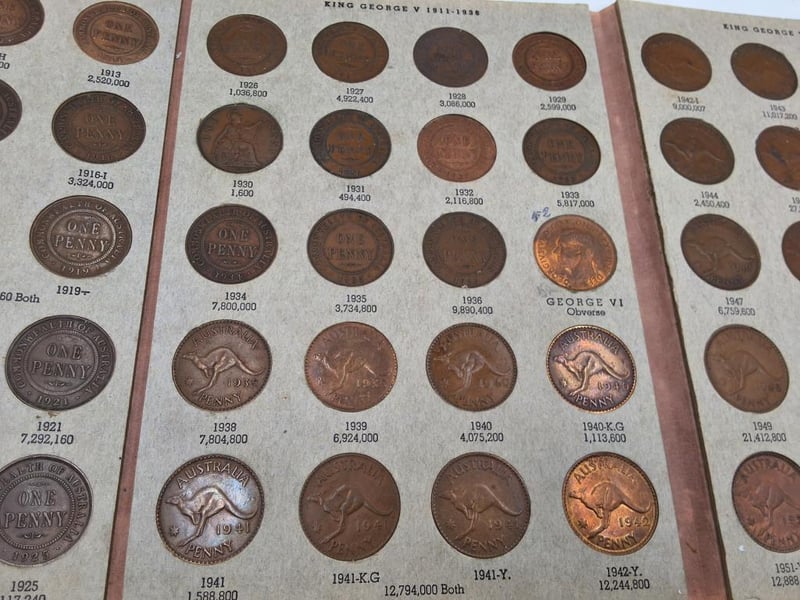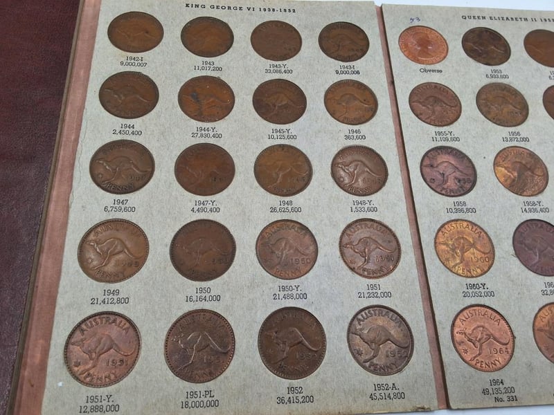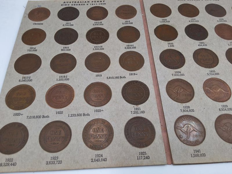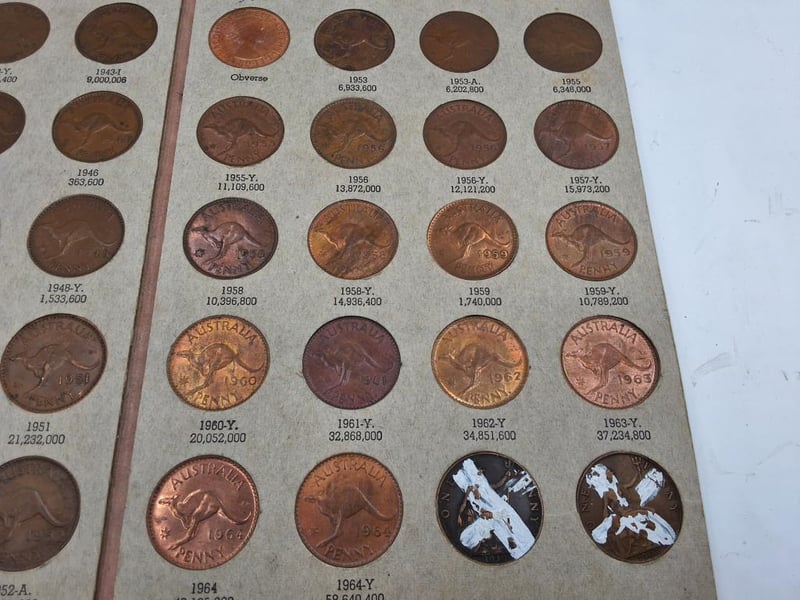 VIRTUALLY COMPLETE AUSTRALIAN PENNY DATE SET 1911 - 1964 MISSING ONLY 1930 BUT WITH KEYS 1925 (VF) & 1946 (AEF) - NOTE THE PAIR OF "2 -UP PENNIES" AND THE ENGLISH INFIL PENNY 782478+14