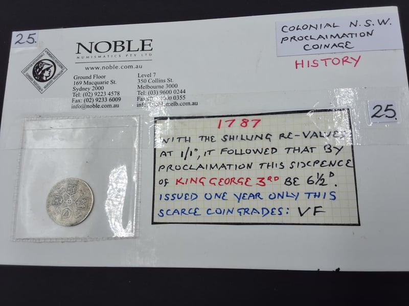 COLONIAL AUSTRALIA : 1787 KING GEORGE 3RD SILVER SIXPENCE - REVALUED @ 6 & 1/2 PENCE BY PROCLAIMATION , CONDITION VF .......HISTORY 782478+25