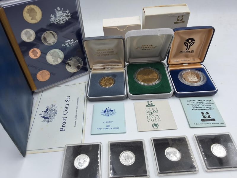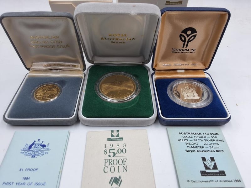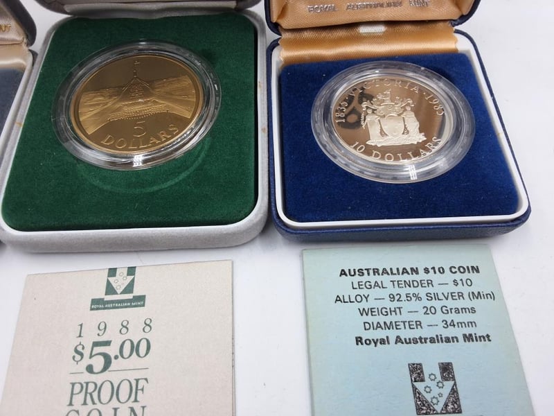 ROYAL AUSTRALIAN MIINT PROOFS : 4 X 999 FINE SILVER 2014 PROOF KOALAS , 1985 $10 VICTORIAN CENTENARY STERLING SILVER CASED COMMEMORATIVE , 1988 $5 & 1984 $1 CASED FIRST ISSUES & 1985 RAM CASED PROOF SET 782478+11