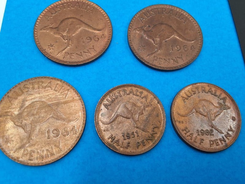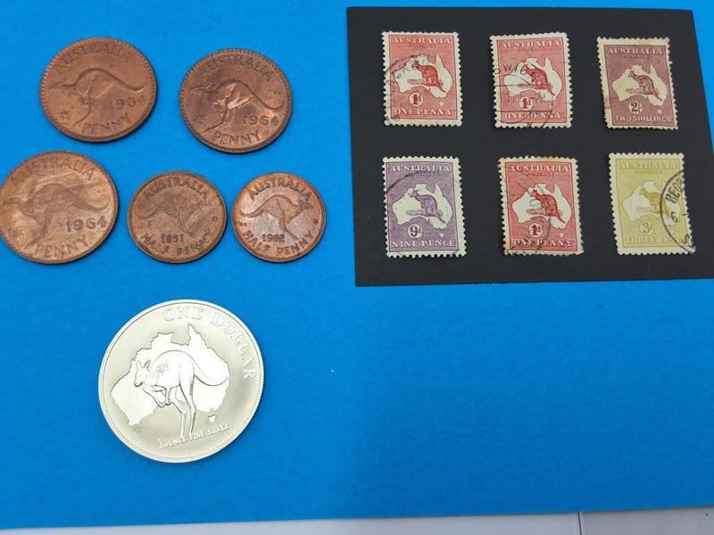 "ROOS" : ONE OUNCE 999 FINE SILVER ROO DOLLAR DATED 2000 , ROO STAMPS & BRIGHT RED ROO PRE - DECIMAL UNC COPPER COINS
