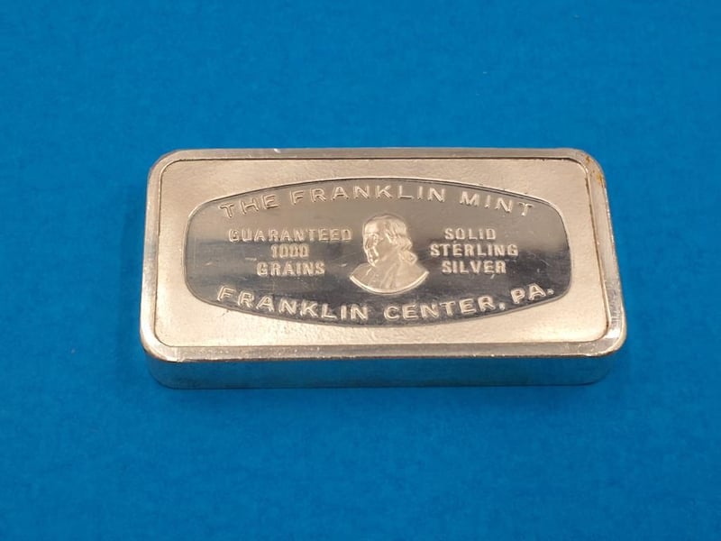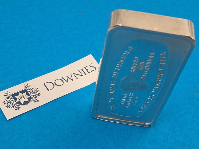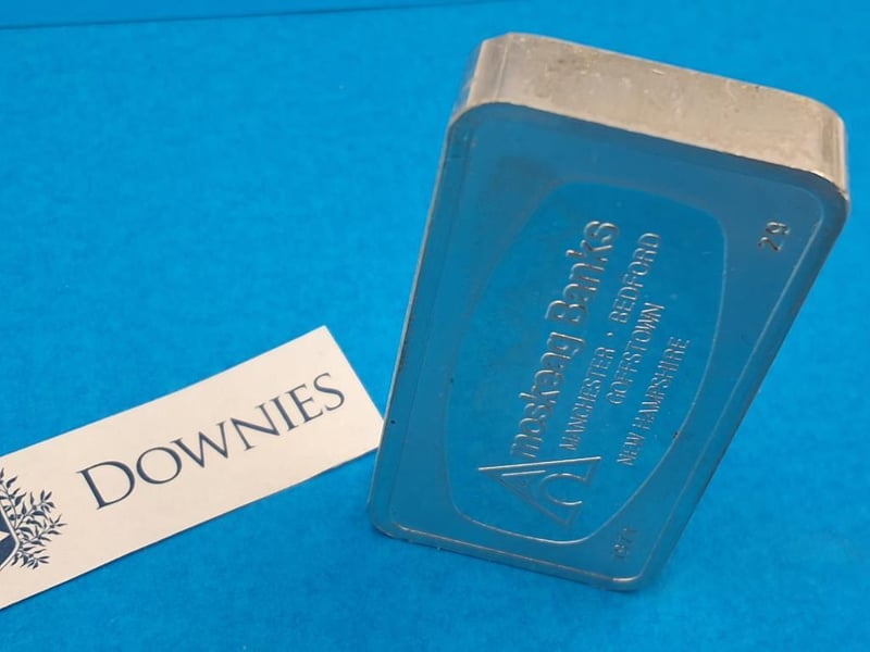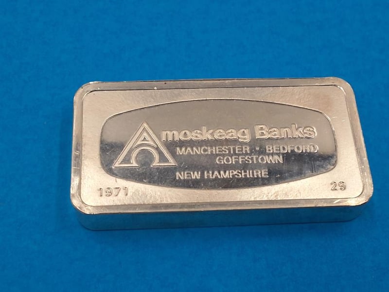 BULLION : SOLID STERLING SILVER 1,000 GRAINS BAR PROVENENCE : THE "AMOSKEAG BANKS , NEW HAMPSHIRE" EX "DOWNIES" , STUCK BY THE FRANKLIN MINT AS A PROOF. 782478+26