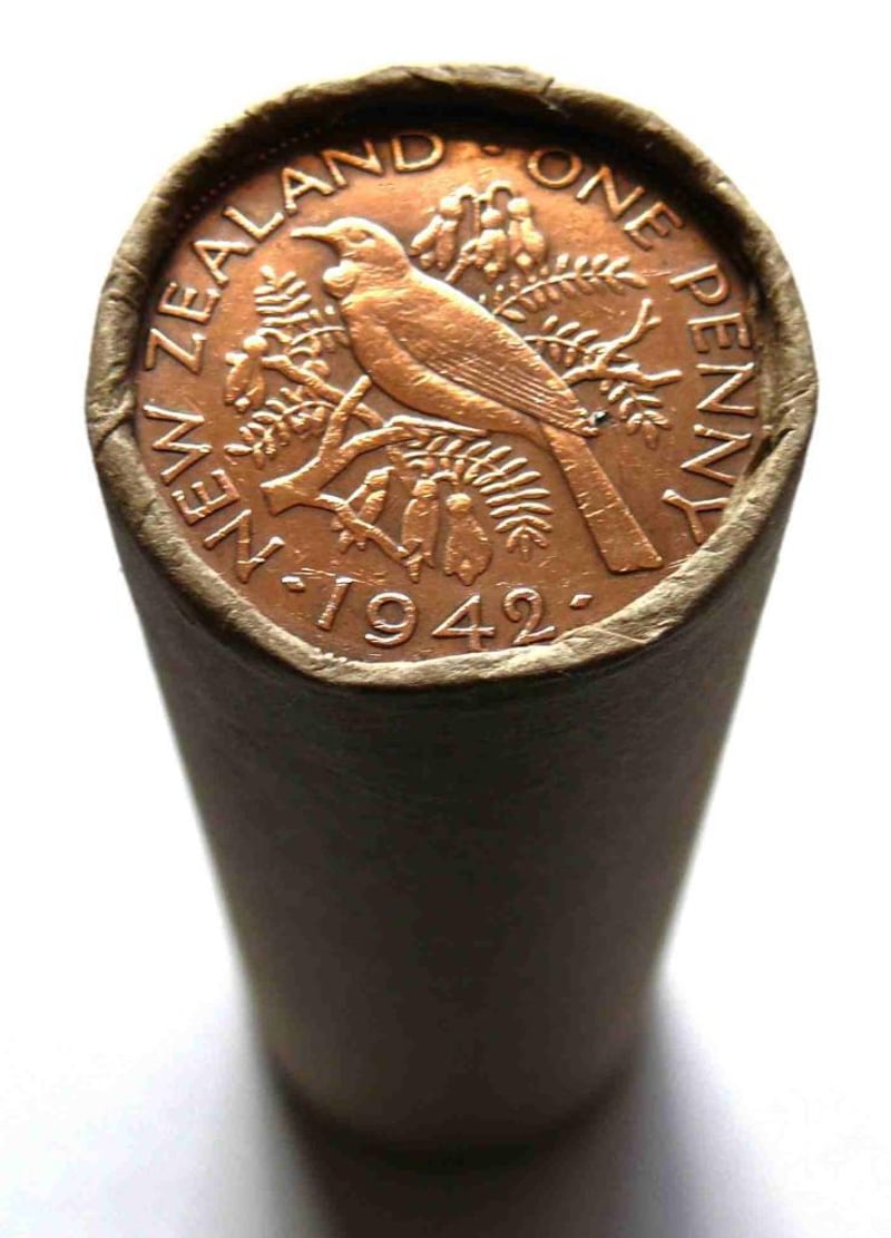 ROLL OF 1942 KGVI, NEW ZEALAND PENNY (50X CIRCULATED COINS IN A ROLL). 488361+24