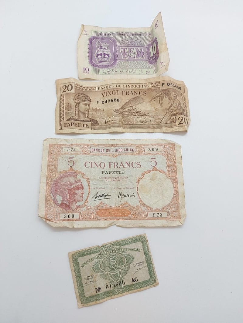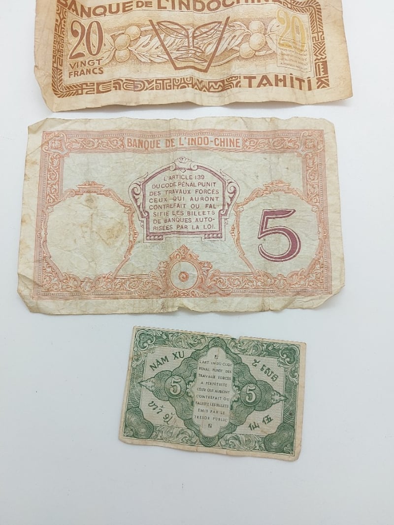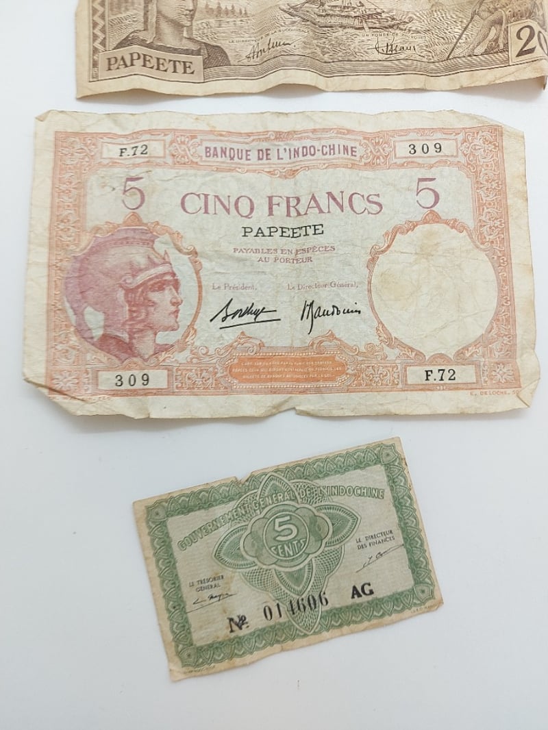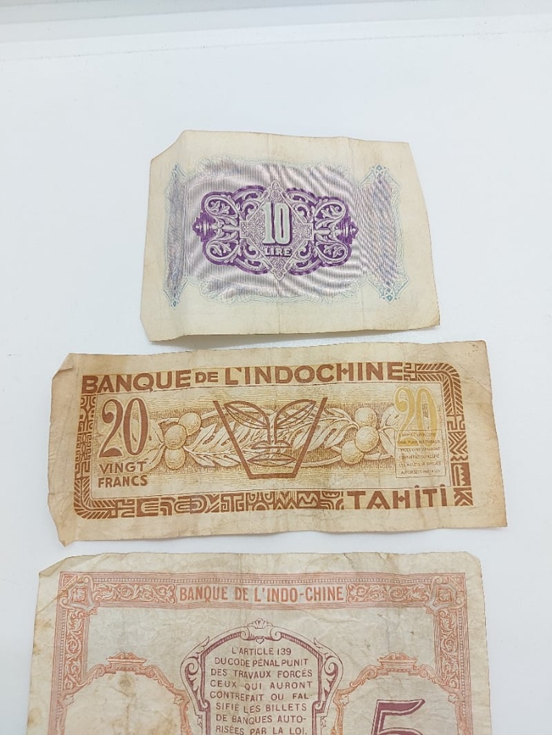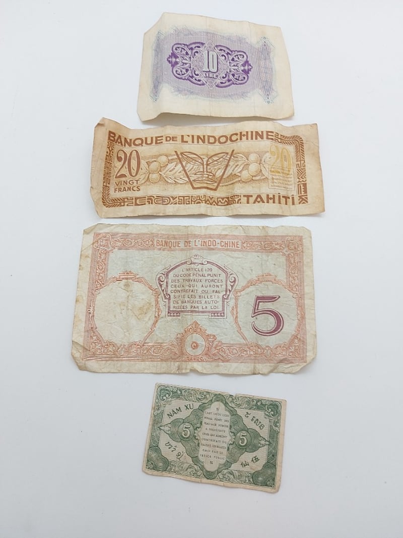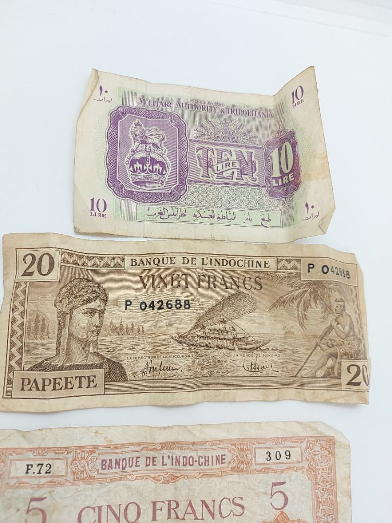 ASSORTED BANK NOTES, TRIPOLITANIA, BANQUE DE LINDOCHINE, 10 LIRE, 20 VINGT FRANCS, 5 CINQ FRANCS, 5 CENTS, QUANTITY 4