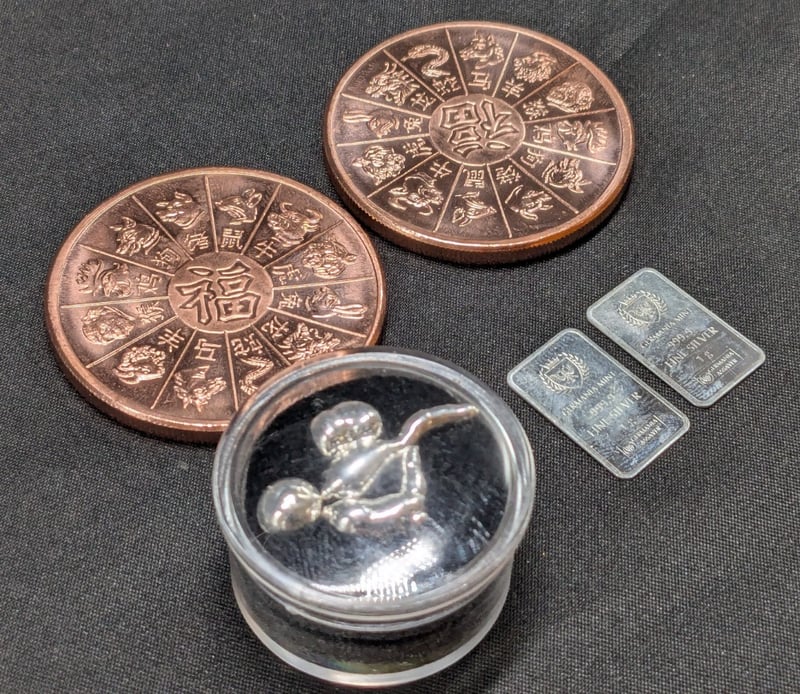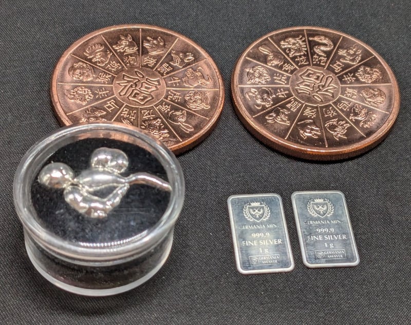 COLLECTION OF SILVER AND COPPERIncludes 5 Grams Silver Scrap, Two Pure Silver Minted Bars, Two Pure Copper Year Of The Dragon Bullion Round585028+11