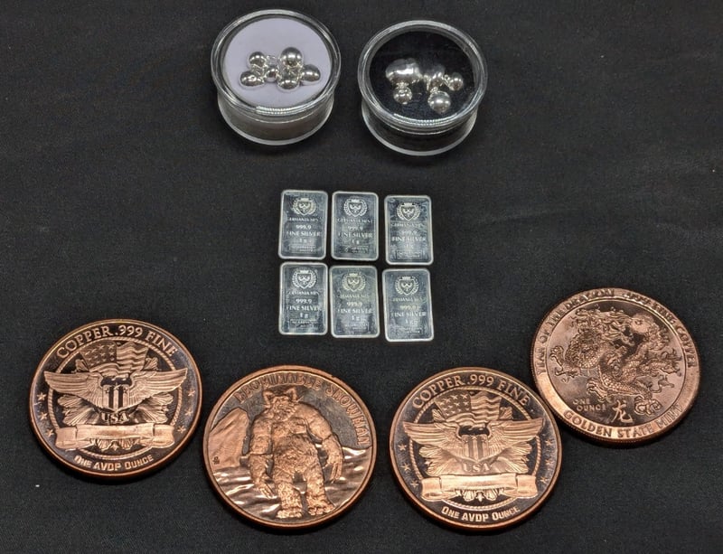 COLLECTION OF SILVER AND COPPERIncludes Two 5 Grams Pure Silver Scraps, Six Minted Bars, Four Pure Copper Bullion Rounds585028+12