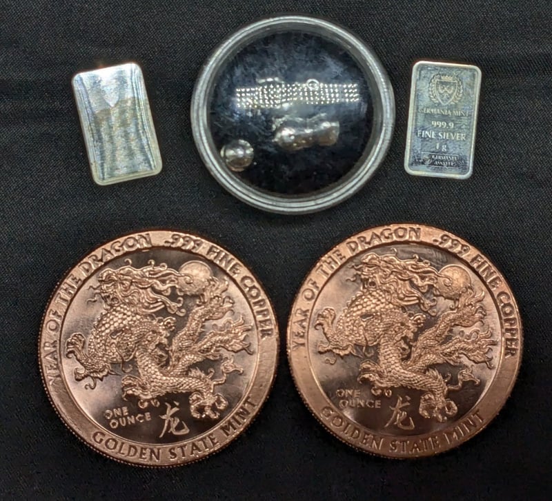 COLLECTION OF SILVER AND COPPERIncludes 5 Grams Silver Scrap, Two Pure Silver Minted Bars, Two Pure Copper Year Of The Dragon Bullion Round585028+14