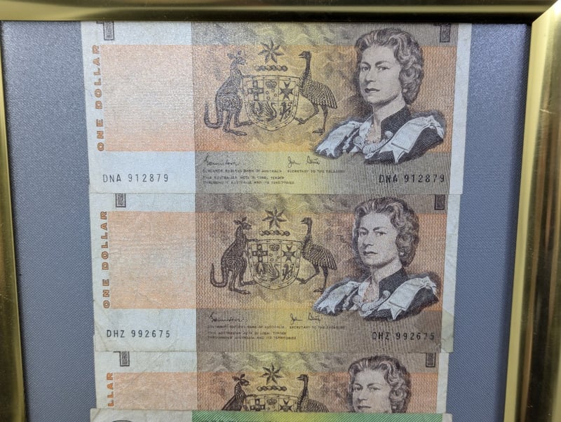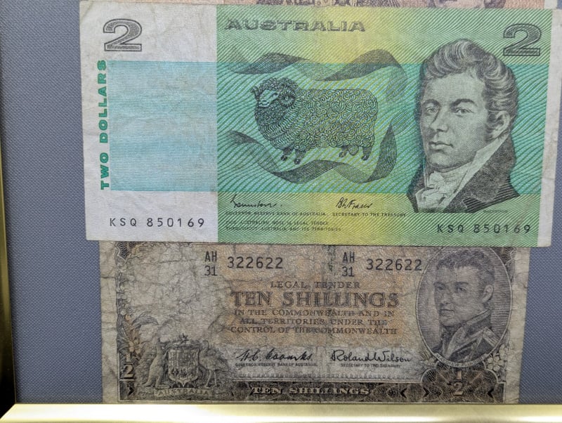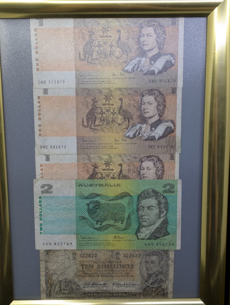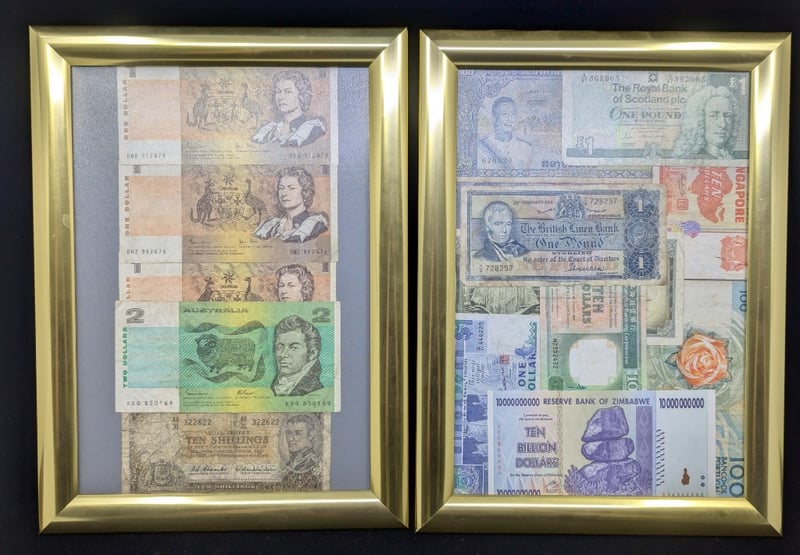 COLLECTION OF AUSTRALIAN AND WORLD BANKNOTES IN FRAMESAusralian Banknotes Include Ten Shillings, One Dollar And Two Dollar Banknotes, Various World BanknotesVarious Conditions586283+1