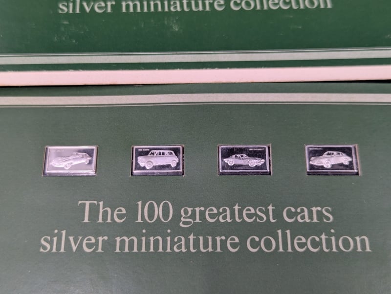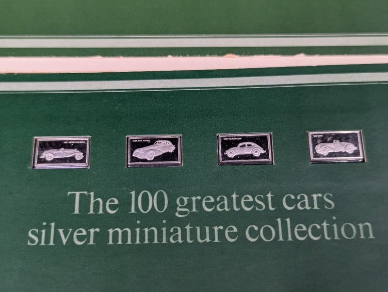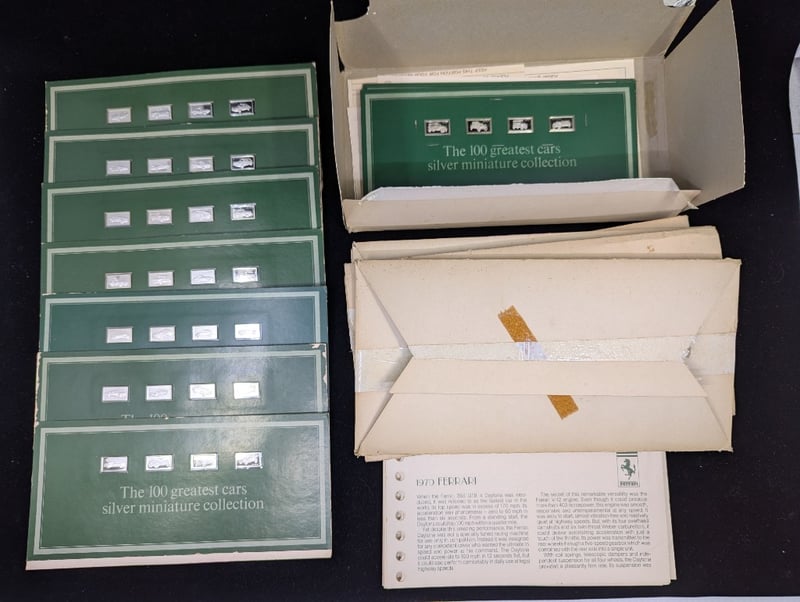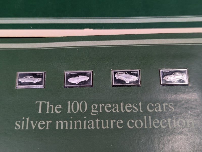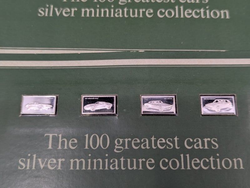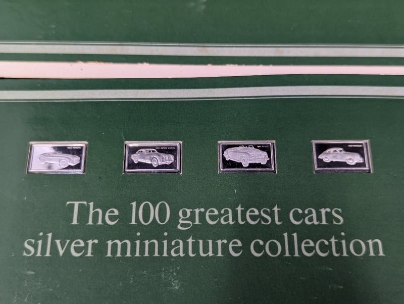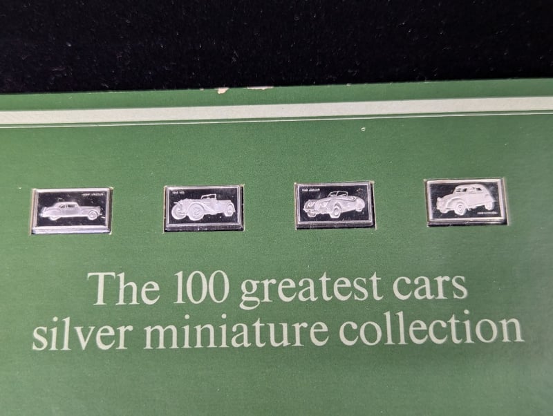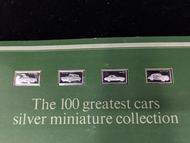 'THE 100 GREATEST CARS SILVER MINIATURE COLLECTION' CARD SETSIncludes Seven Cards Featuring Four Silver Bars Each, Editions 925/1000,Each Bar Features Car From Set, Includes Information Cards On Cars586304+1