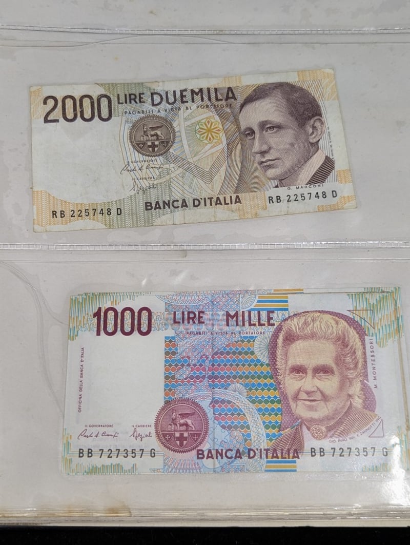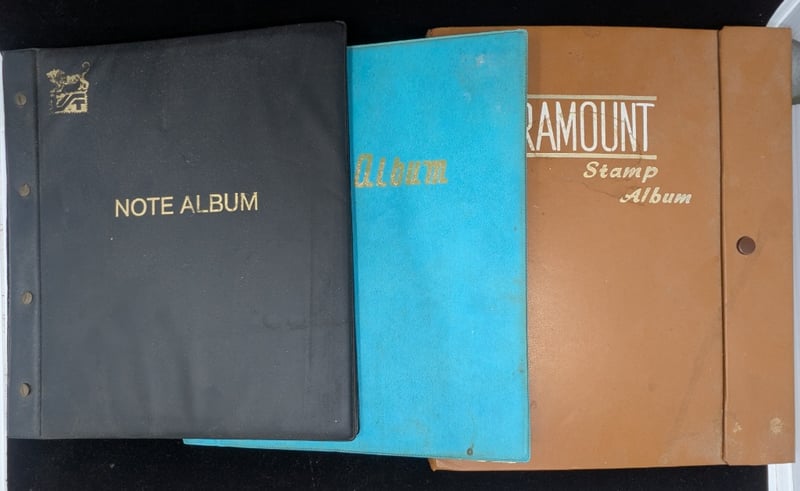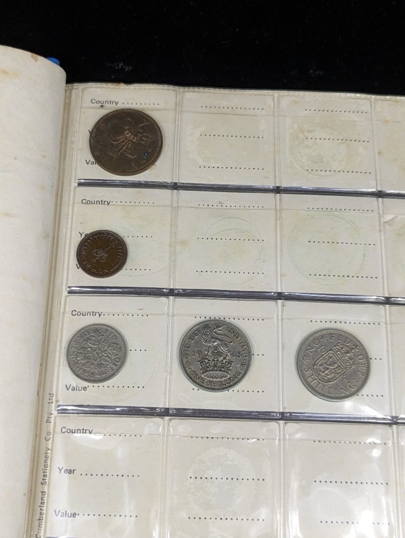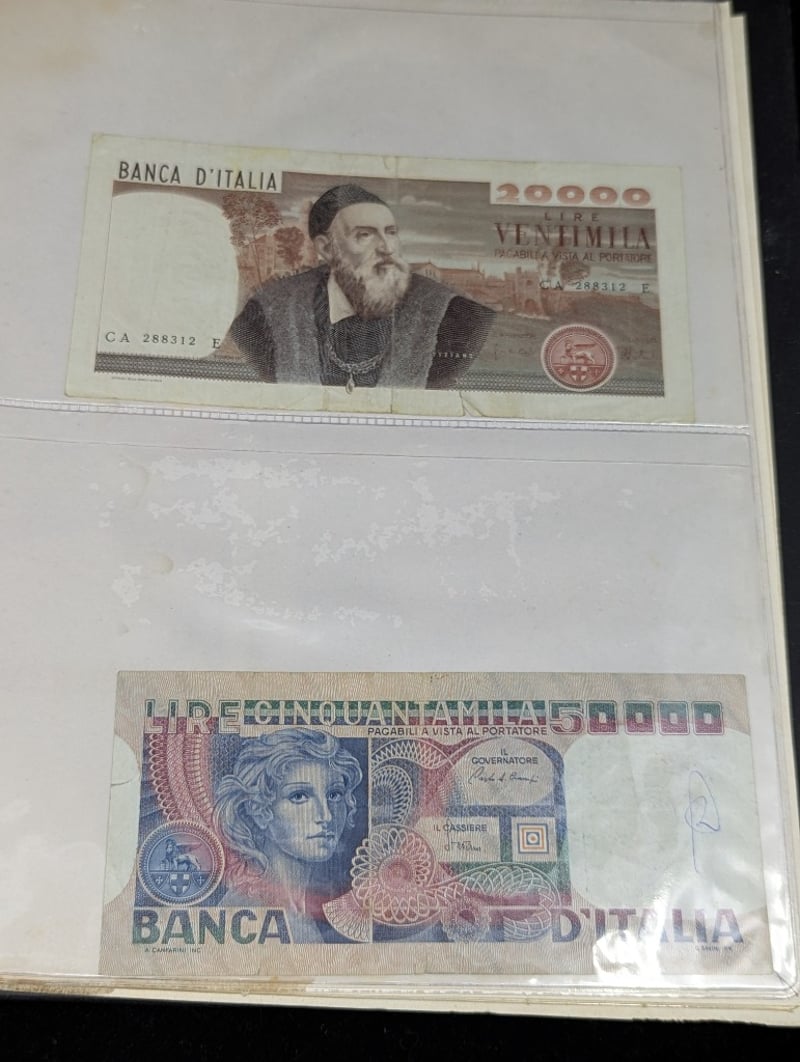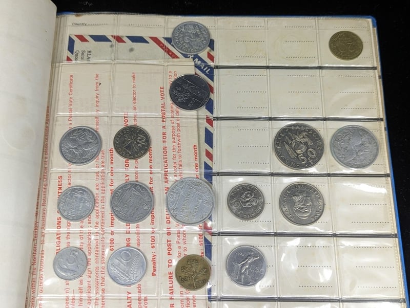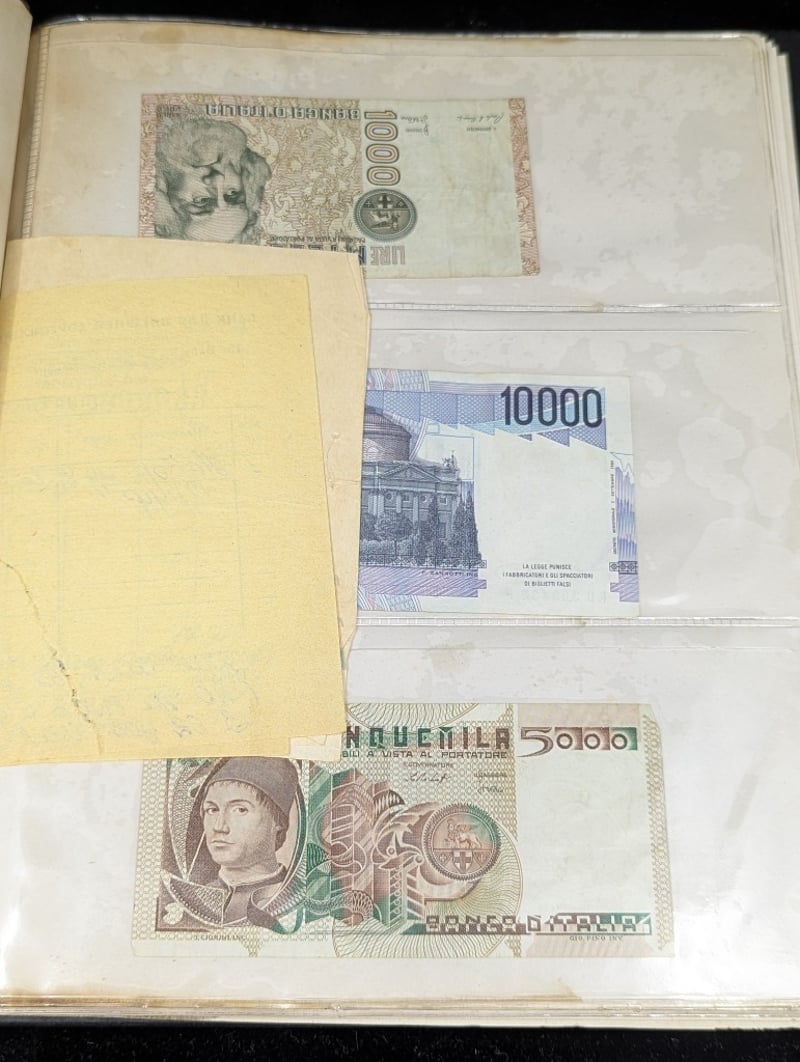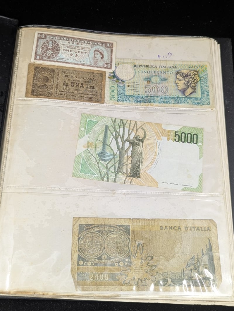 COLLECTION OF WORLD BANKNOTES, COINS AND STAMPS IN ALBUM