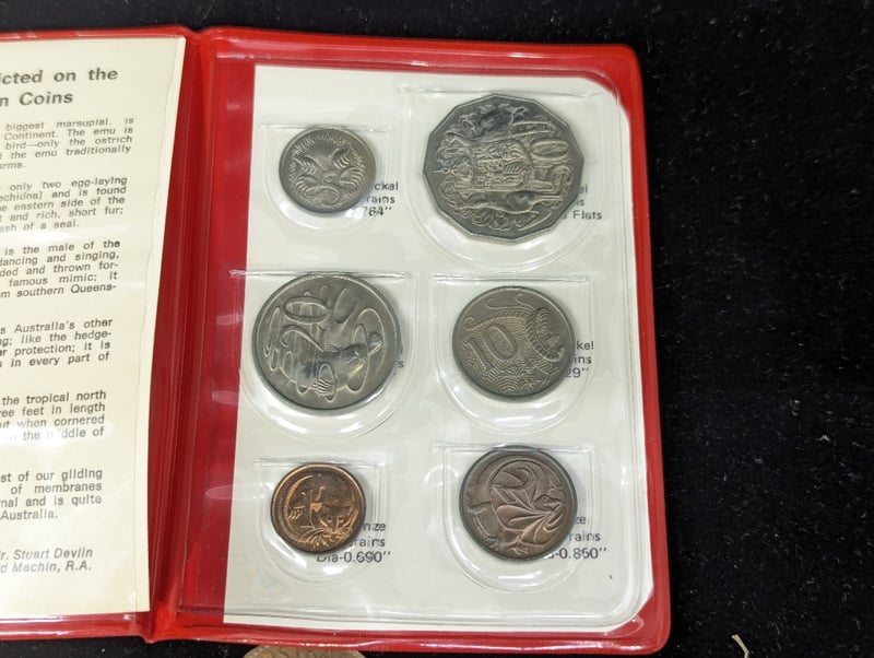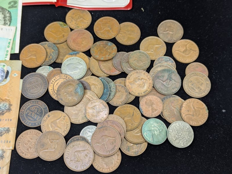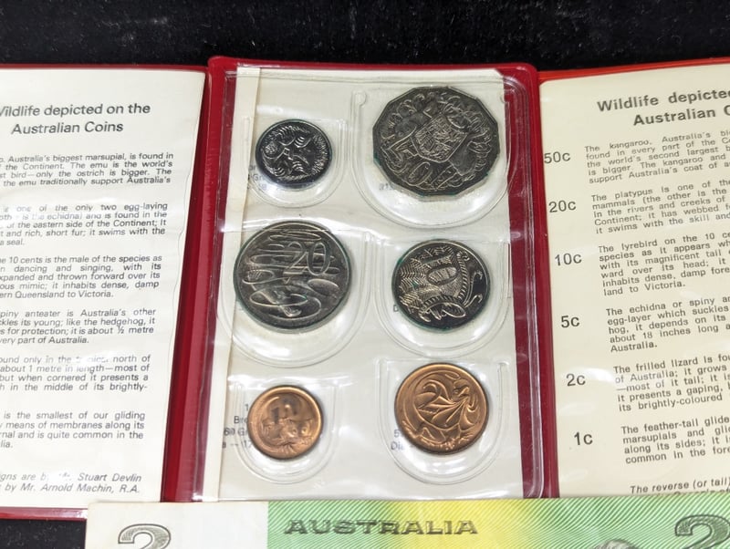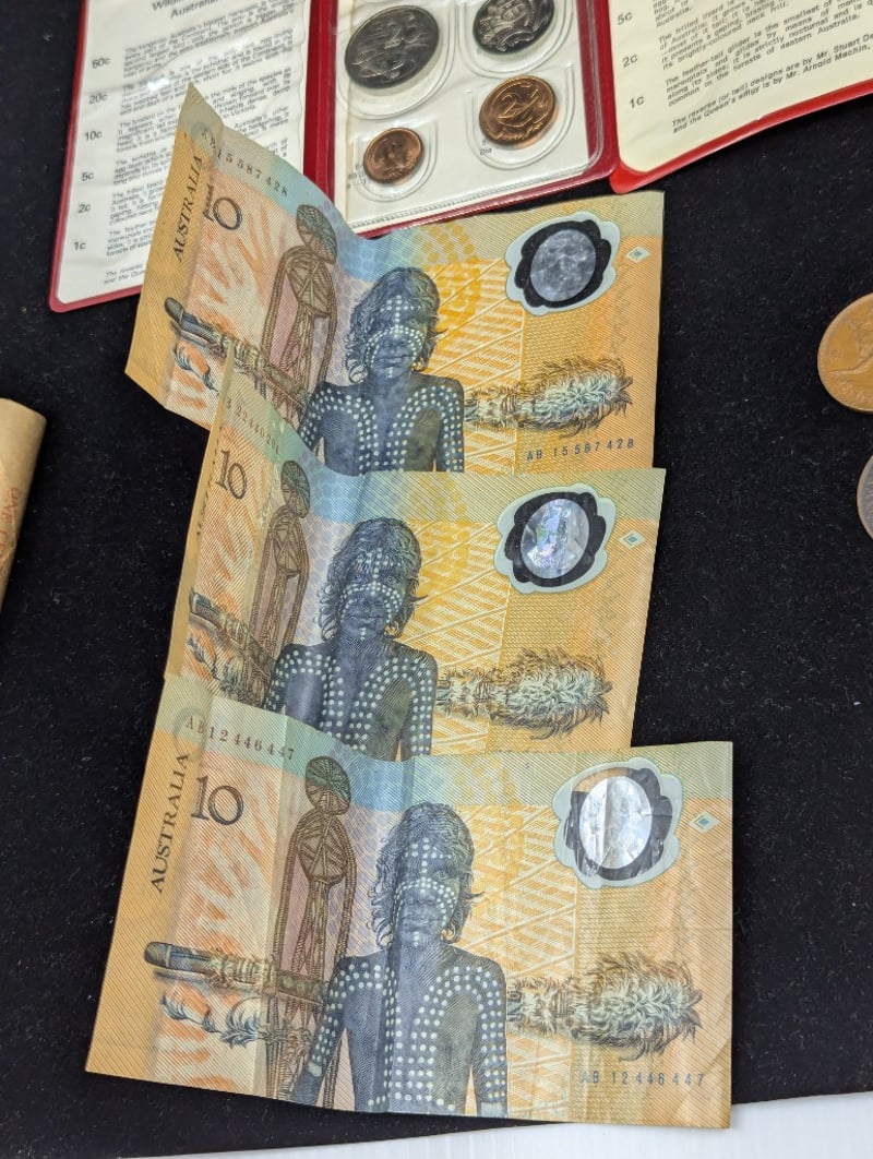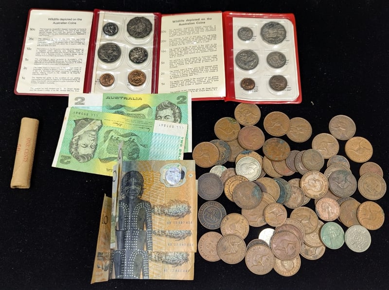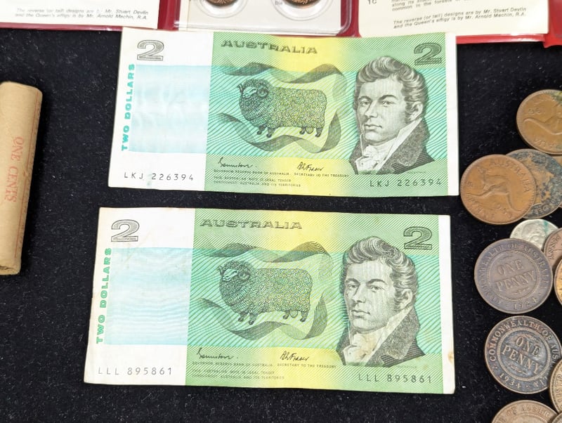 COLLECTION OF AUSTRALIAN COINS AND BANKNOTESCoin Includes Penny Of Various Dates Of Issue, 1975 & 1976 Coin Sets In Red Ram Folders, Ten And Two Dollar Banknotes, One Cent Coin Roll586304+7