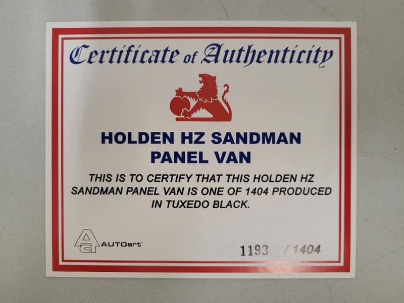 HOLDEN HZ SANDMAN PANEL VAN FROM AUTO ART. SCALE: 1:18. CERTIFICATE NO. 1193 OF 1404.
