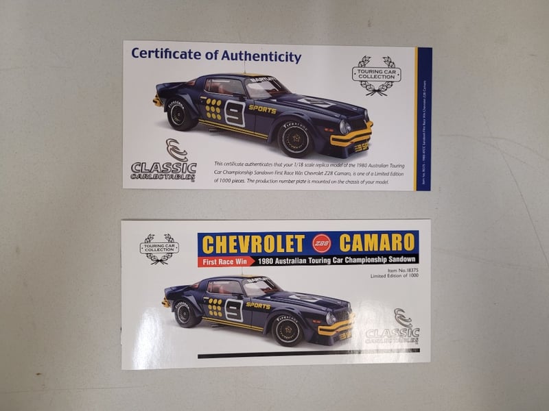 CHEVROLET Z28 CAMARO FROM CLASSIC CARLECTABLES. 198 AUSTRALIAN TOURING CAR CHAMPIONSHIP SANDOWN. SCALE 1:18. CERTIFICATE NO. 18375.