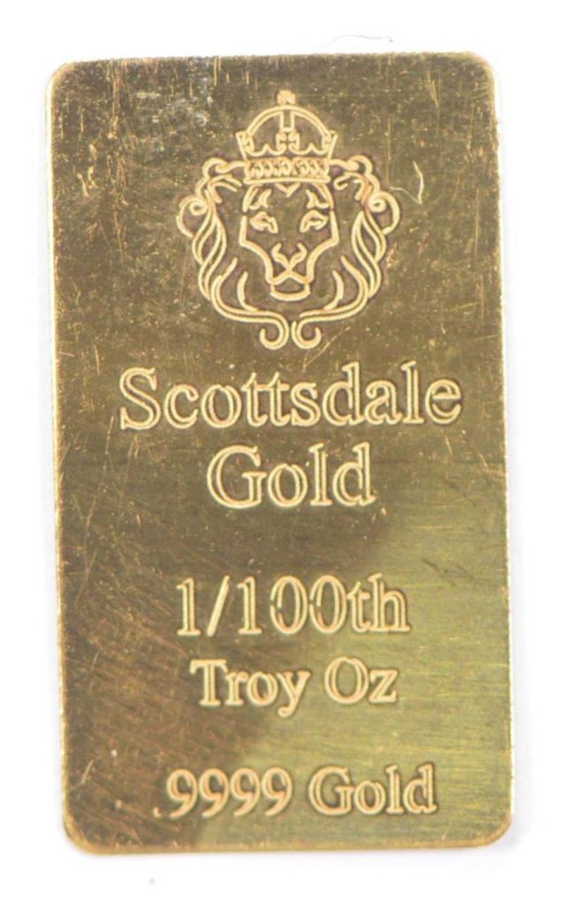 SCOTTSDALE LION 1/100OZ 9999 GOLD BULLION BAR