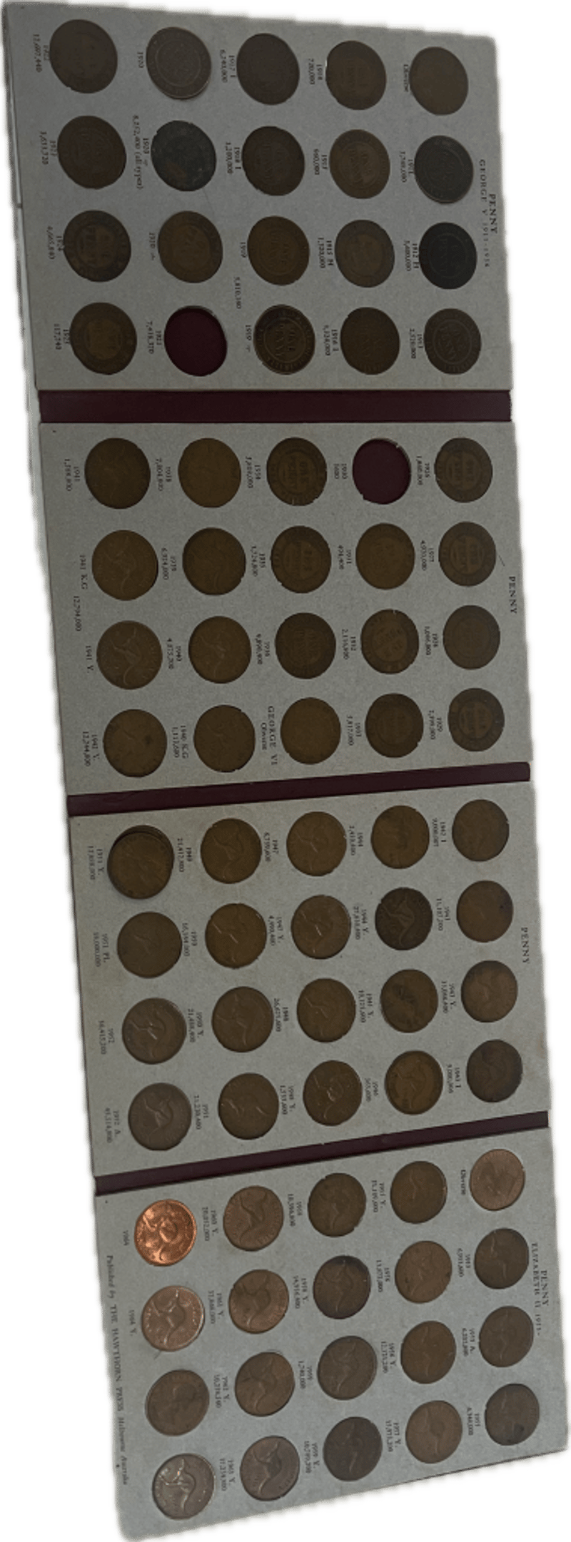 AUSTRALIA COMPLETE SET OF PENNIES SET INCLUDING 1925 & 1946 PENNIES TOTAL PENNIES 79 AUSTRALIAN MISSING IS 1930 PENNY 1925 & 1946 VERY NICE HIGH GRADE…PLEASE NOTE CONDITION OF ALBUM IS POOR & TORN DUE TO THE AGE OF THE ALBUM WHICH IS MORE THAN 80 YEARS.