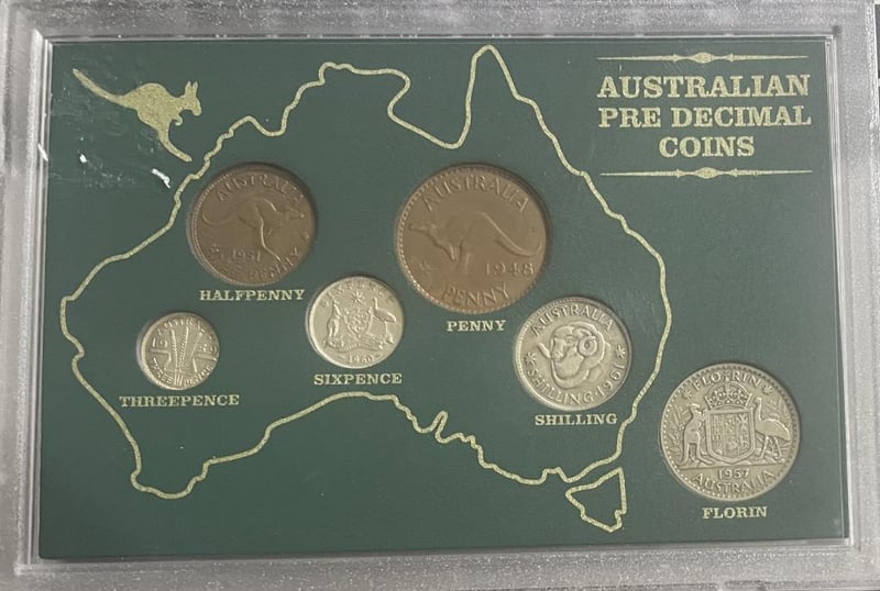 AUSTRALIA PRE DECIMAL COINS SET IN GREEN PERPEX CASE