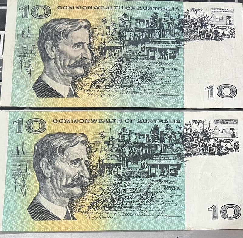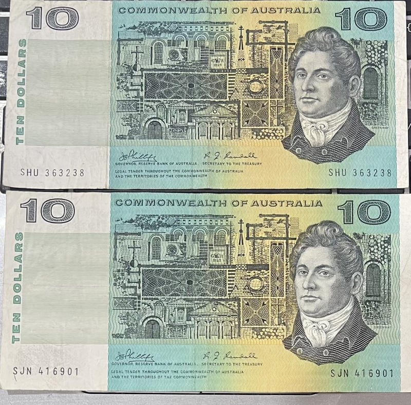 TEN DOLLAR COMMONWEALTH OF AUSTRALIA PHILLIP/RANDALL BANKNOTES SERIAL NO SJN 416901 & SHU 363238