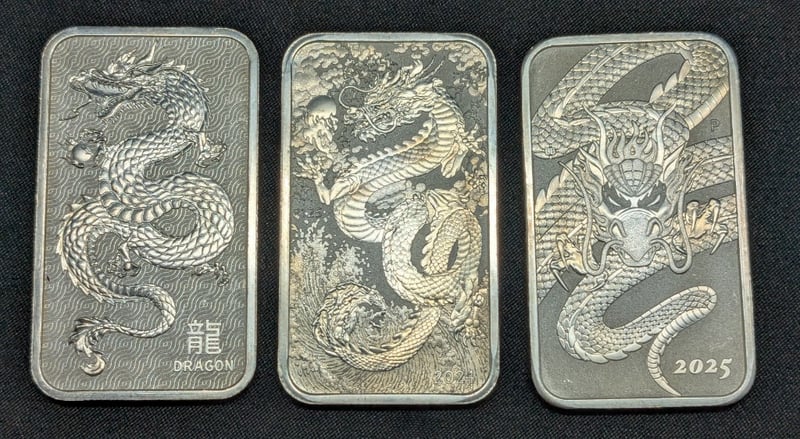 Bars Include 1 Oz 999 Pure Silver Dragon Bar, 2024 Yr Of Dragon Rectangular Coin, 2025 Yr Of Dragon Rectangular Coin