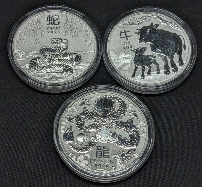 THREE PERTH MINT LUNAR SERIES .999 SILVER COINSSeries Includes 2021 Year Of The Ox, 2024 Year Of The Dragon, 2025 Year Of The Snake585028+3