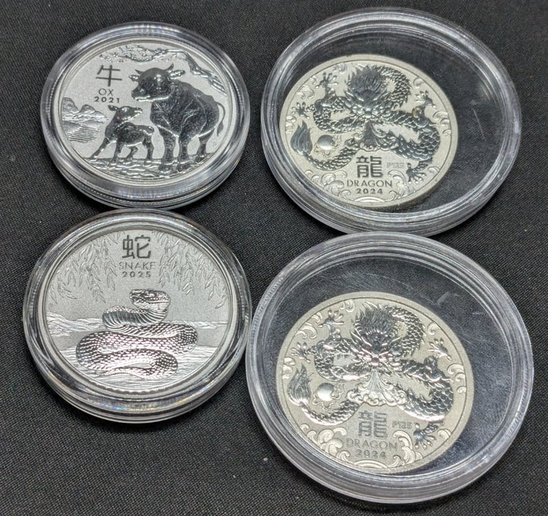 Coins Include Two 2024 Year Of The Dragon Coins, 2021 Year Of The Ox, 2025 Year Of The Snake Coin