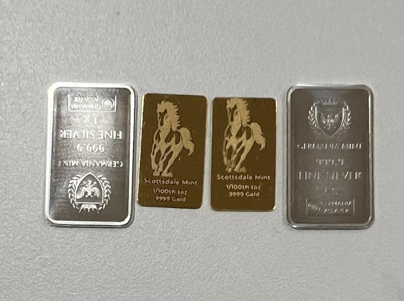 SCOTTSDALE GOLD HORSE 1/100OZ 9999 GOLD BULLION BAR X 2 AND GERMANIA 1 GRAM SILVER BAR X 2