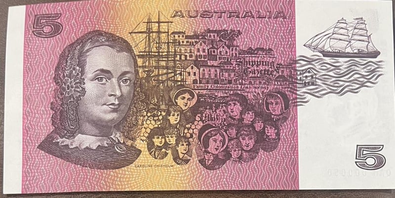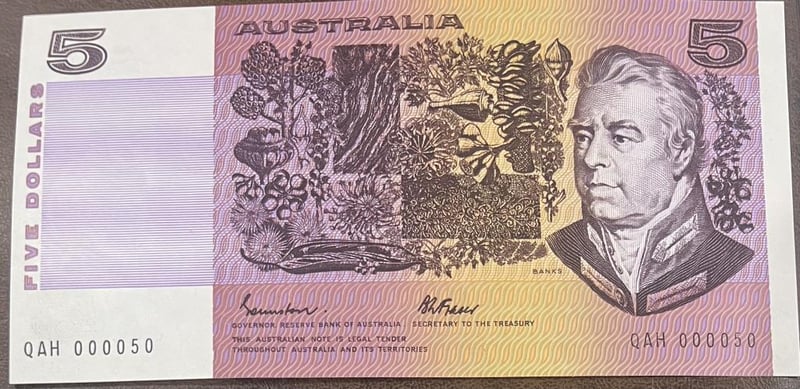 1985 AUSTRALIA FIVE DOLLARS JOHNSTON/FRASER SERIAL QAH 000050 UNC---VERY RARE SERIAL NUMBER 311149+97