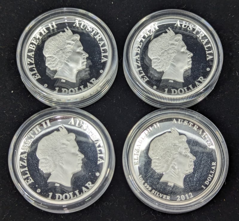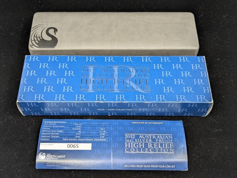 2012 AUSTRALIAN FOUR 1OZ SILVER PROOF COIN SET, HIGH RELIEF COLLECTIONIncludes Certificate Of Authenticity, Coin Number 0065Condition: Proof586285+2