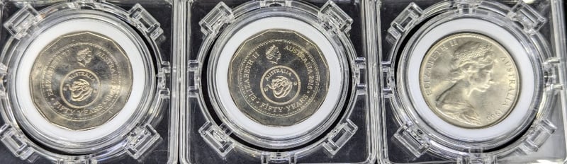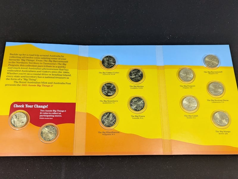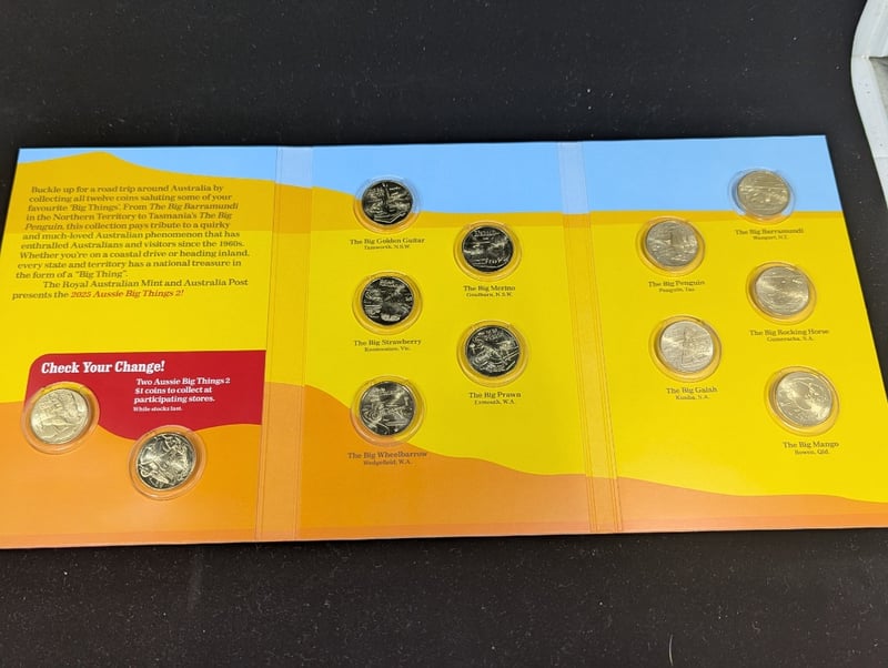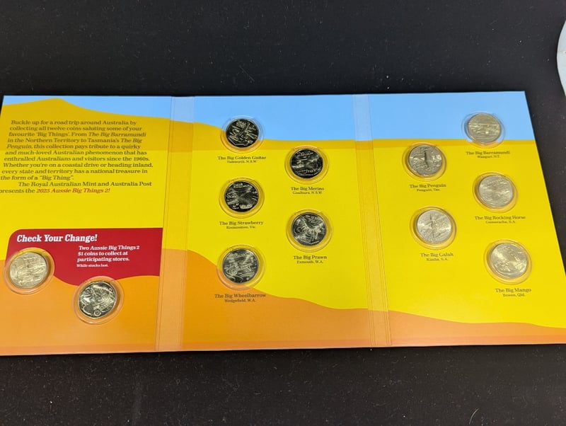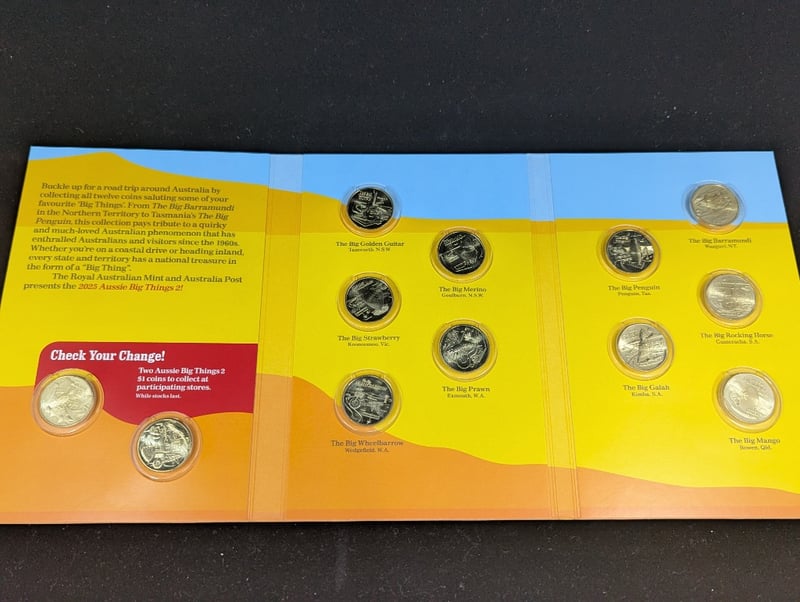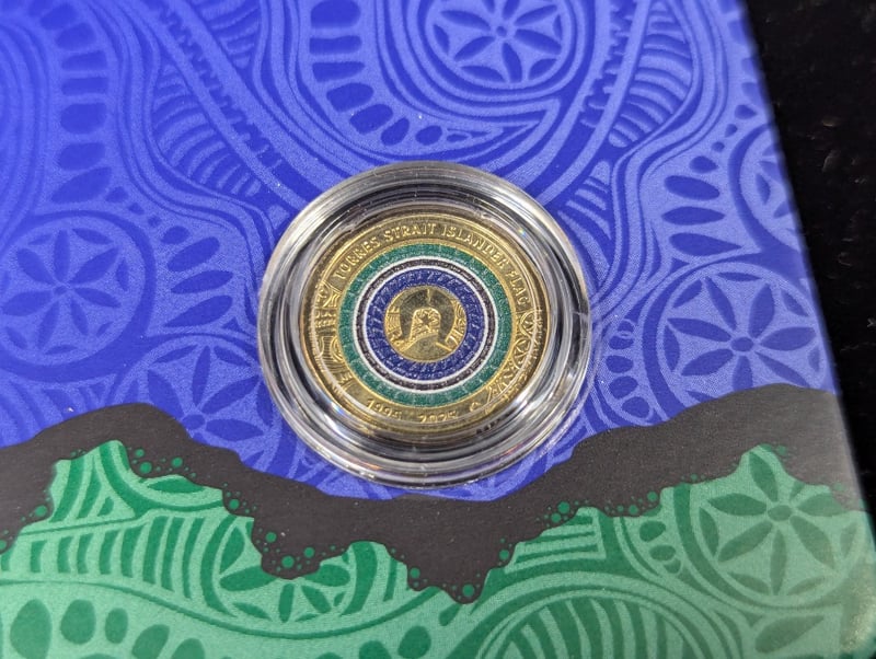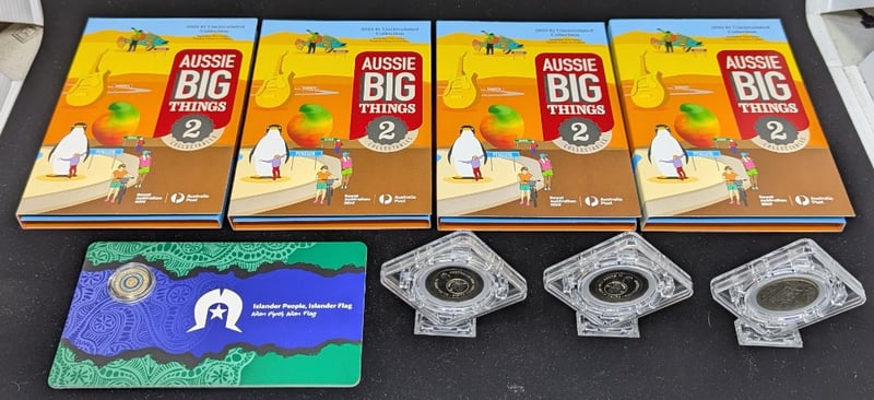 FOUR 2025 AUSSIE BIG THINGS 2 COIN SETS IN FOLDERS, 2025 AUSTRALIAN TORRES STRAIT ISLANDER FLAG TWO DOLLAR COIN AND THREE FIFTY CENT COINS IN DISPLAY CASESFifty Cent Coins Include Two 2016 50Th Anniversary End Of Decimal Currency And 1966 Round Fifty Cent CoinConditions Range From Approx Ef - Unc586285+6