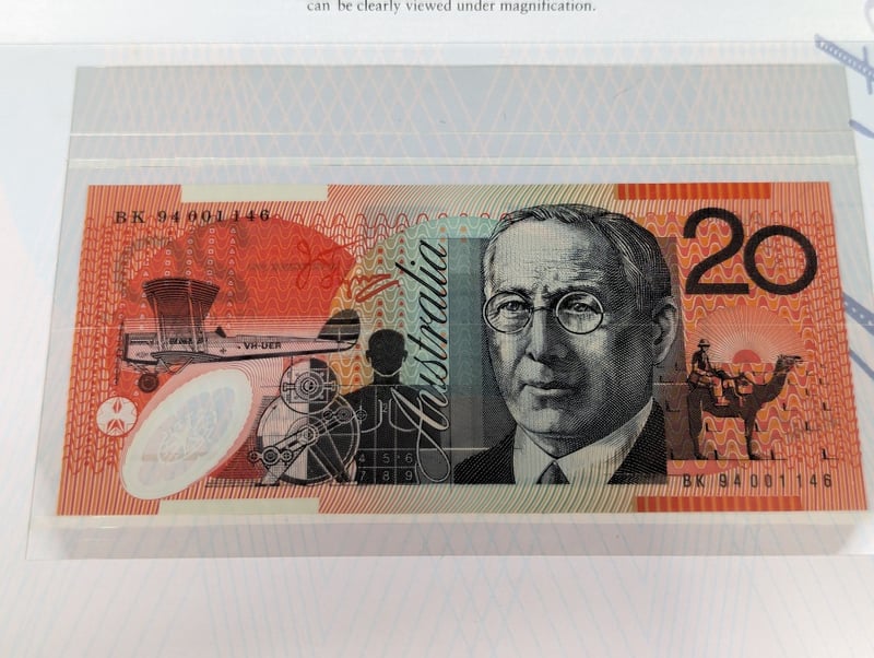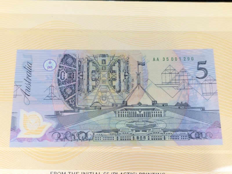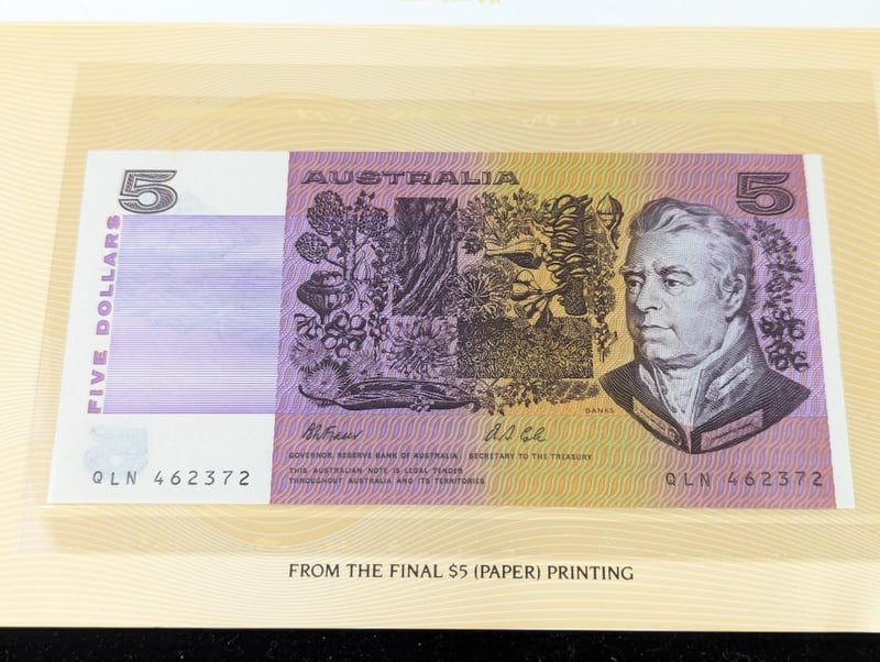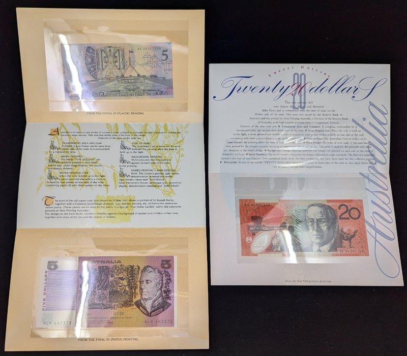 FIVE DOLLAR FIRST AND LAST POLYMER BANKNOTE WITH PALE GREEN SERIAL NUMBER AND TWENTY DOLLAR OVERPRINT POLYMER BANKNOTECondition: Aunc586285+30