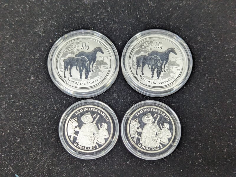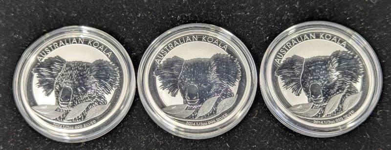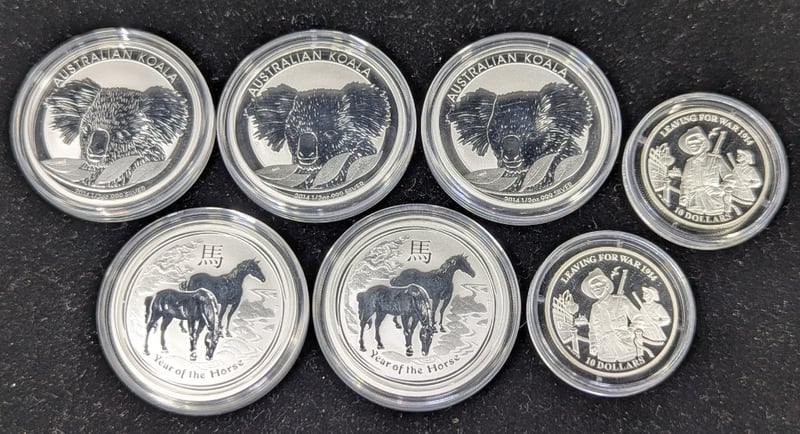 SEVEN 2014 AUSTRALIAN SILVER COINSIncludes Three Australian Koala 1/2 Oz 999 Silver Coins, Two 2014 Year Of The Horse 1/2 Oz Coins, Two 2014 'Leaving For War 1914' Ten Dollar CoinsCondition: Proof586285+36