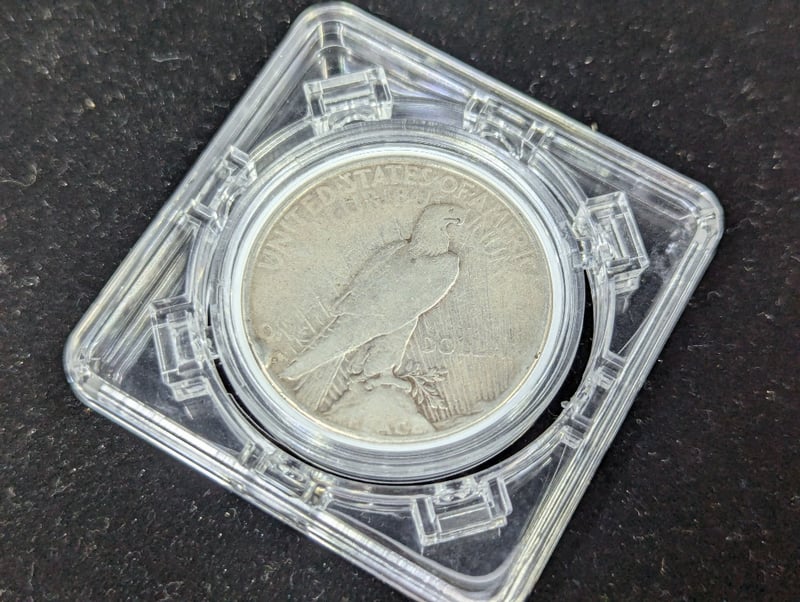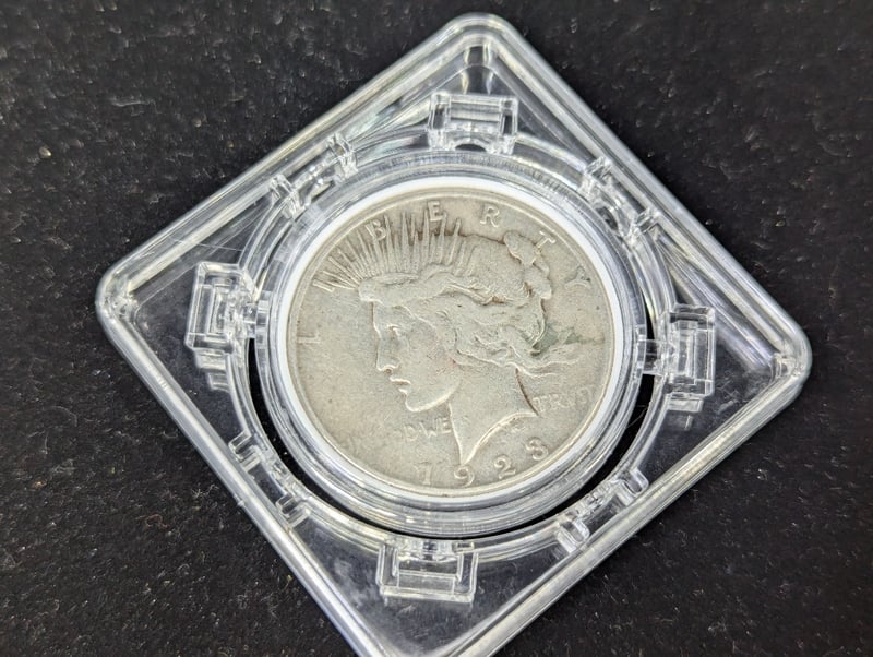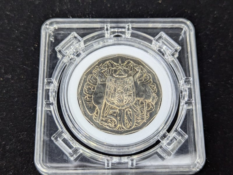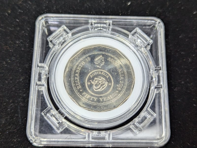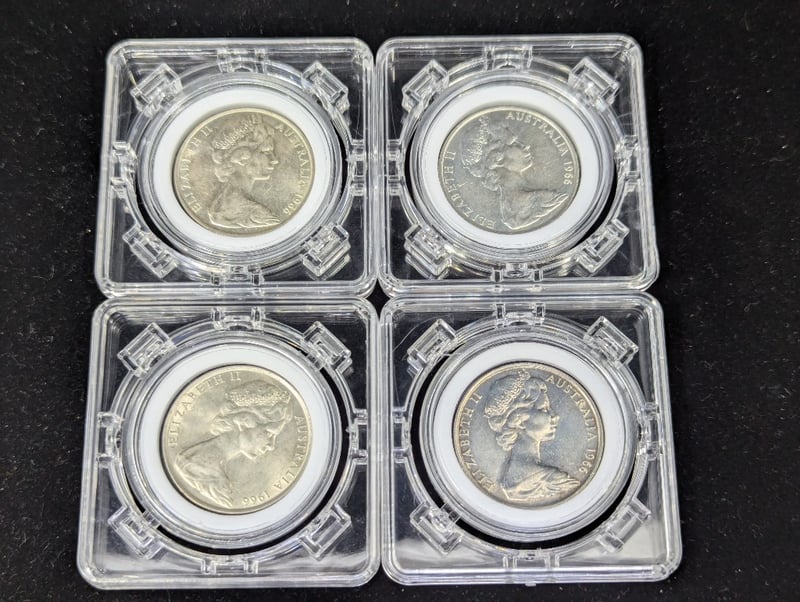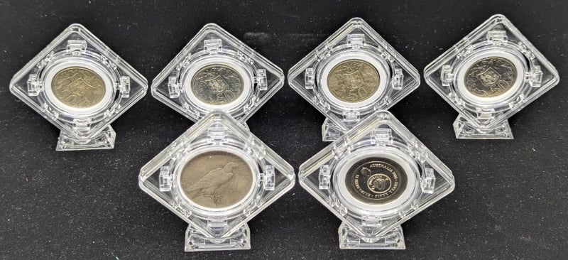 FOUR 1966 AUSTRALIAN ROUND FIFTY CENT COINS, 2016 FIFTY YEARS OF DECIMAL CURRENCY FIFTY CENT COIN, 1923 USA LIBERTY ONE DOLLARCoins In Display Cases With Rotating CentreConditions Range From Approx: Good - Ef586285+37