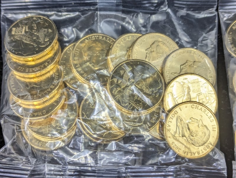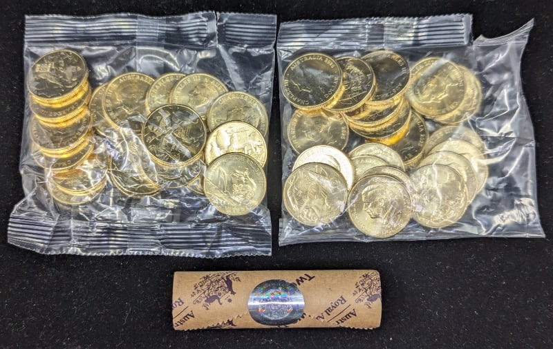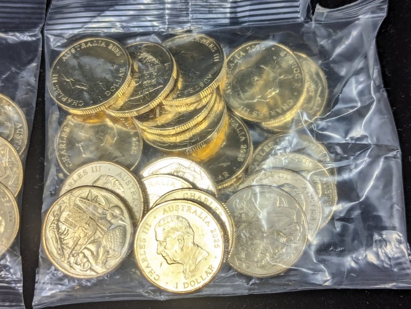 TWO 2025 AUSSIE BIG THINGS ONE DOLLAR COIN BAGS AND 2025 RED POPPY TWO DOLLAR REMEMBRANCE COIN ROLLCondition: Aunc586285+40