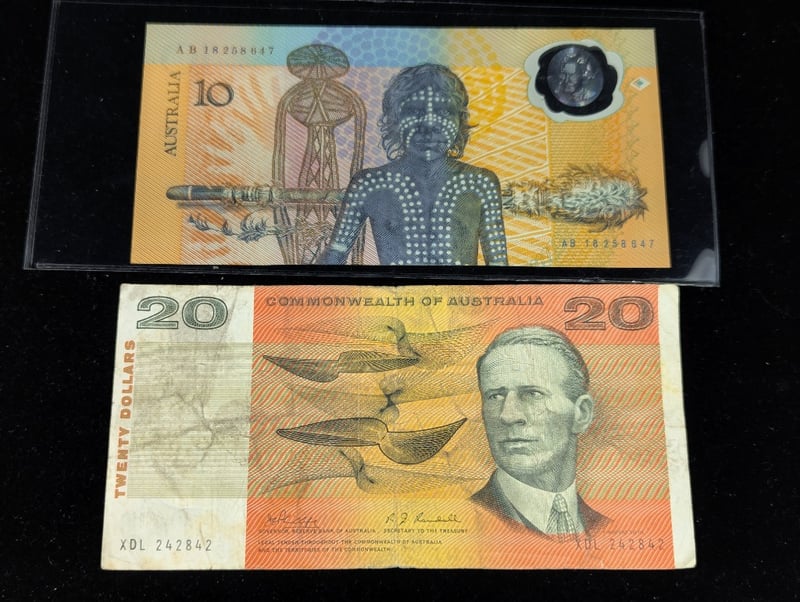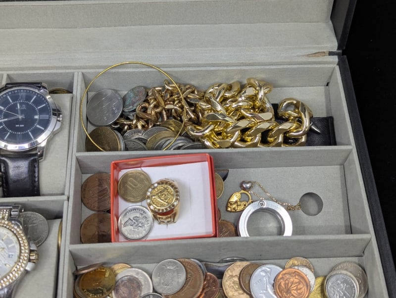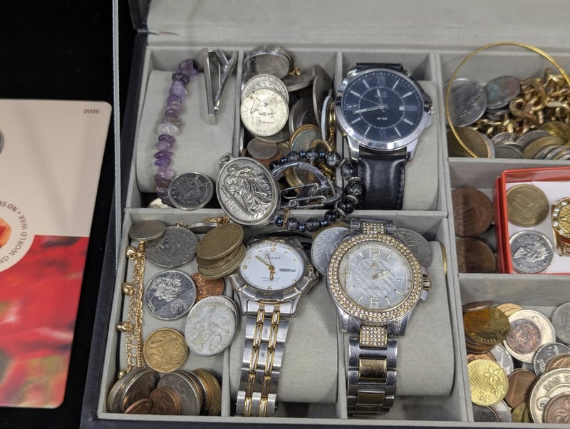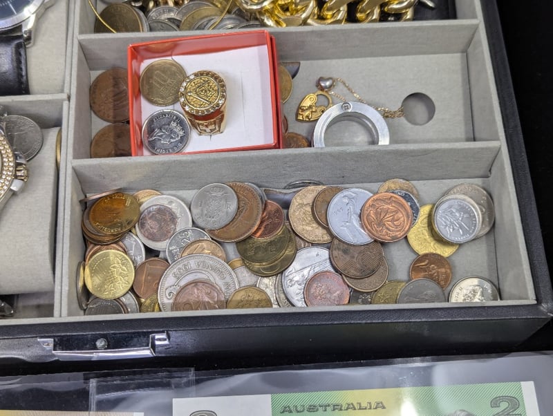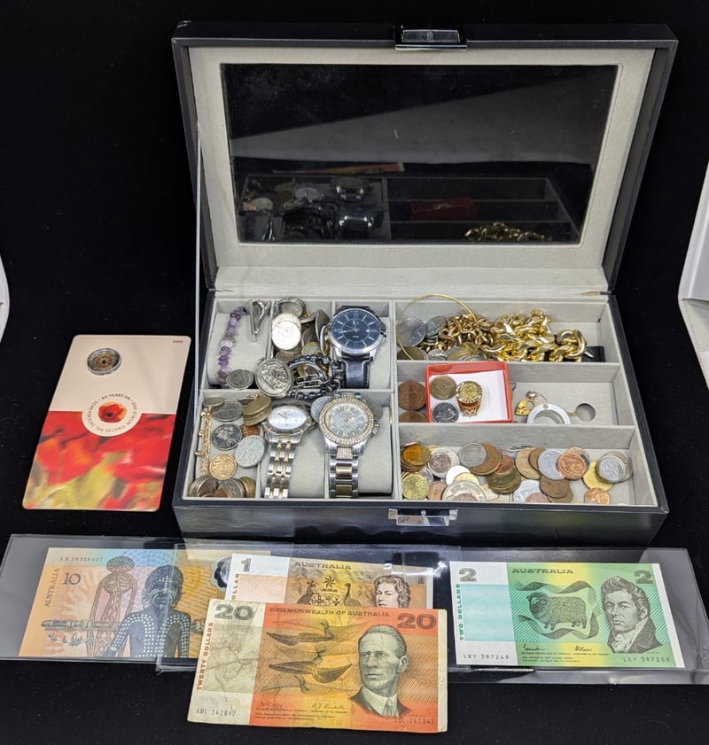 JEWELLERY BOX WITH COLLECTION OF AUSTRALIAN AND WORLD COINS/BANKNOTES, WATCHES AND JEWELLERY PIECESBanknotes Include Australian Ten Dollar Polymer Banknote (Ab18), One Dollar Banknote Signed By Johnston/Stone, Twenty Dollar Signed By Phillips/Randall, Two Dollar Signed By Johnston/Fraser,2025 Red Poppy Remembrance Two Dollar Coin In Card, Various World Coins, Three Watches, Movement Untested, Various Jewellery Pieces586285+54