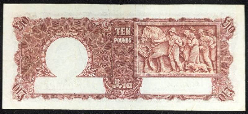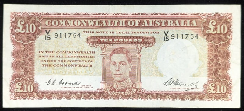1949 FIRST PREFIX COMMONWEALTH OF AUSTRALIA TEN POUND BANKNOTE SIGNED BY COOMBS/WATTS, V15