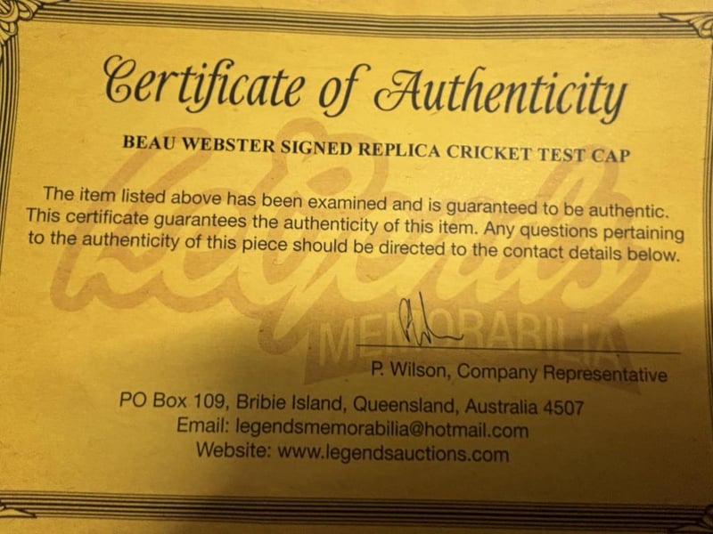 Beau Webster Personally Signed Replica Australian Baggy Green Test Cap. The Item Is Accompanied By A Certificate Of Authenticity.