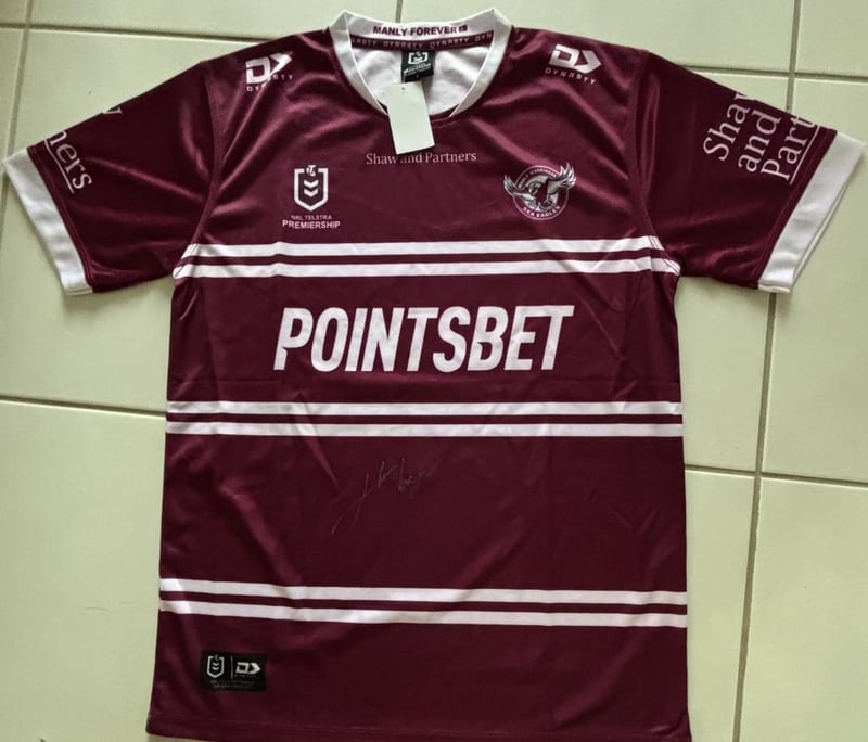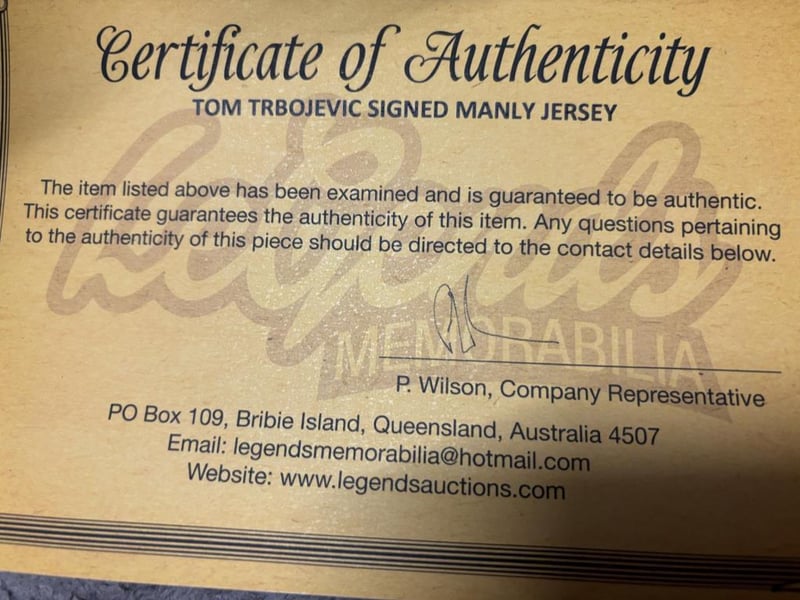 TOM TRBOJEVIC SIGNED MANLY JERSEY Tom Trbojevic Personally Signed Manly Jersey. The Jersey Is Size L. The Item Is Accompanied By A Certificate Of Authenticity. Condition: Good - Refer To Images 585039+4