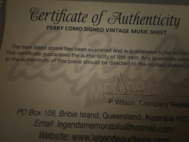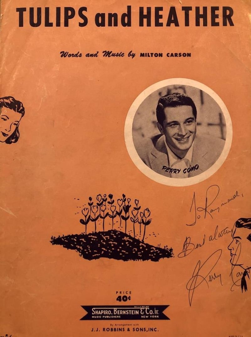 Perry Como (D 2001) Personally Signed Sheet Music For 'Tulips And Heather'. The Item Is Accompanied By A Certificate Of Authenticity.